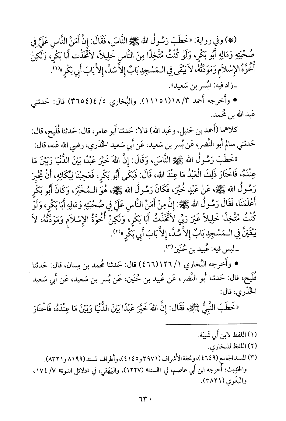 «خطب رسول الله صَلى الله عَليه وسَلم الناس، وقال: إن الله خير عبدًا بين الدنيا وبين ما عنده، فاختار ذلك العبد ما عند الله، قال: فبكى أَبو بكر، فعجبنا لبكائه، أن يخبر رسول الله صَلى الله عَليه وسَلم عن عبد خير، فكان رسول الله صَلى الله عَليه وسَلم هو المخير، وكان أَبو بكر أعلمنا، فقال رسول الله صَلى الله عَليه وسَلم: إن من أمن الناس علي في صحبته وماله أبا بكر، ولو كنت متخذا خليلا غير ربي لاتخذت أبا بكر، ولكن أخوة الإسلام ومودته، لا يبقين في المسجد باب إلا سد، إلا باب أَبي بكر» (¬١).