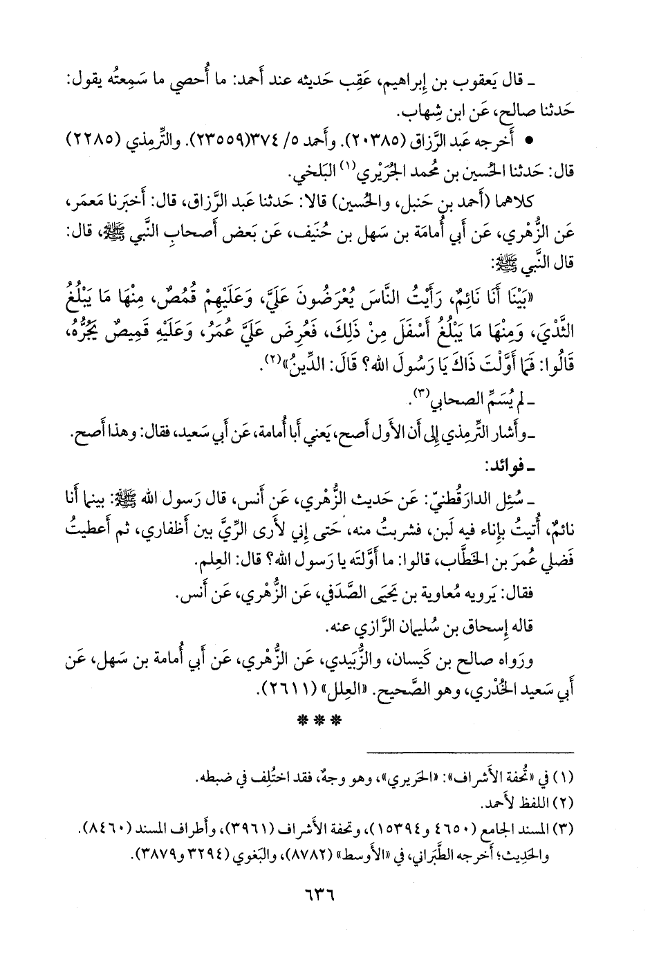 كلاهما (أحمد بن حنبل، والحسين) عن عبد الرزاق بن همام، عن مَعمَر بن راشد، عن الزُّهْري، عن أَبي أُمامة بن سهل بن حنيف، عن بعض أصحاب النبي صَلى الله عَليه وسَلم قال: قال النبي صَلى الله عَليه وسَلم: