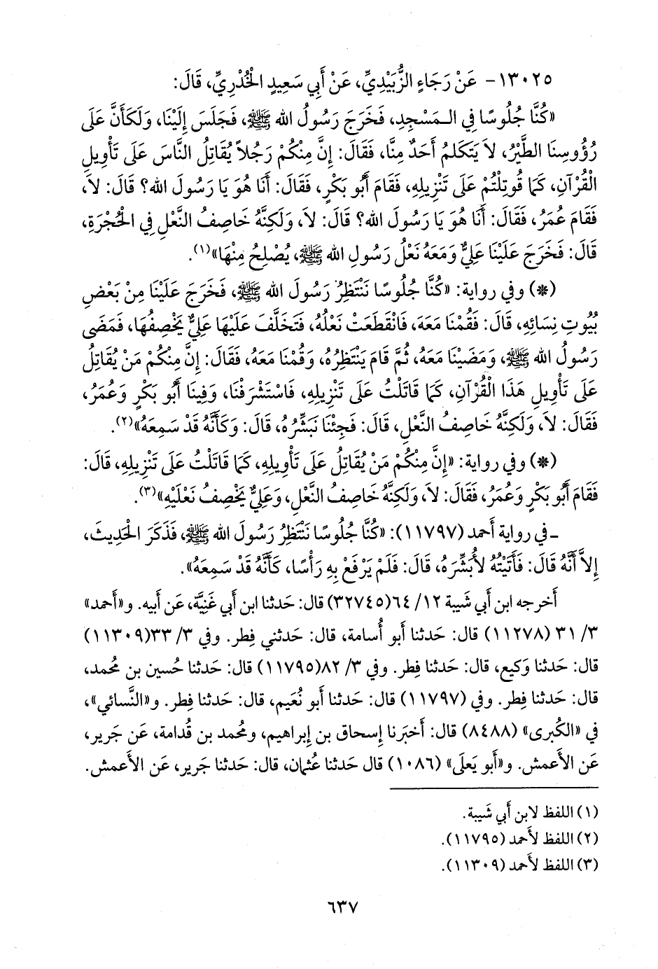 - وفي رواية: «كنا جلوسا ننتظر رسول الله صَلى الله عَليه وسَلم فخرج علينا من بعض بيوت نسائه، قال: فقمنا معه، فانقطعت نعله، فتخلف عليها علي يخصفها، فمضى رسول الله صَلى الله عَليه وسَلم ومضينا معه، ثم قام ينتظره، وقمنا معه، فقال: إن منكم من يقاتل على تأويل هذا القرآن، كما قاتلت على تنزيله، فاستشرفنا، وفينا أَبو بكر وعمر، فقال: لا، ولكنه خاصف النعل، قال: فجئنا نبشره، قال: وكأنه قد سمعه» (¬٢).