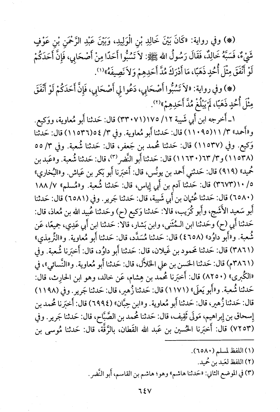 وفي (١١٥٣٨ و ١١٦٣٠) قال: حدثنا أَبو النضر (¬١)، قال: حدثنا شعبة. و «عَبد بن حُميد» (٩١٩) قال: حدثني أحمد بن يونس، قال: أخبرنا أَبو بكر بن عياش. و «البخاري» (٣٦٧٣) قال: حدثنا آدم بن أبي إياس، قال: حدثنا شعبة. و «مسلم» ٧/ ١٨٨ (٦٥٨٠) قال: حدثنا عثمان بن أبي شيبة، قال: حدثنا جَرير. وفي (٦٥٨١) قال: حدثنا أَبو سعيد الأشج، وأَبو كُريب، قالا: حدثنا وكيع (ح) وحدثنا عُبيد الله بن معاذ، قال: حدثنا أبي (ح) وحدثنا ابن المثنى، وابن بشار، قالا: حدثنا ابن أَبي عَدي، جميعا، عن شعبة. و «ابن ماجة» (١٦١) قال: حدثنا محمد بن الصباح، قال: حدثنا جَرير (ح) وحدثنا علي بن محمد، قال: حدثنا وكيع (ح) وحدثنا أَبو كُريب، قال: حدثنا أَبو معاوية. و «أَبو داود» (٤٦٥٨) قال: حدثنا مُسدد، قال: حدثنا أَبو معاوية. و «التِّرمِذي» (٣٨٦١) قال: حدثنا محمود بن غَيلان، قال: حدثنا أَبو داود، قال: أخبرنا شعبة. وفي (٣٨٦١ م) قال: حدثنا الحسن بن علي الخَلَّال، قال: حدثنا أَبو معاوية. و «النَّسَائي» في «الكبرى» (٨٢٥٠) قال: أخبرنا محمد بن هشام، عن خالد، وهو ابن الحارث، قال: حدثنا شعبة. و «أَبو يَعلى» (١١٧١) قال: حدثنا زهير، قال: حدثنا جَرير. وفي (١١٩٨) قال: حدثنا زهير، قال: حدثنا أَبو معاوية. و «ابن حِبَّان» (٦٩٩٤) قال: أخبرنا محمد بن إسحاق بن إبراهيم مولى ثقيف، قال: حدثنا محمد بن الصباح، قال: حدثنا جَرير. وفي (٧٢٥٣) قال: أخبرنا الحسين بن عبد الله القطان، بالرَّقَّة، قال: حدثنا موسى بن