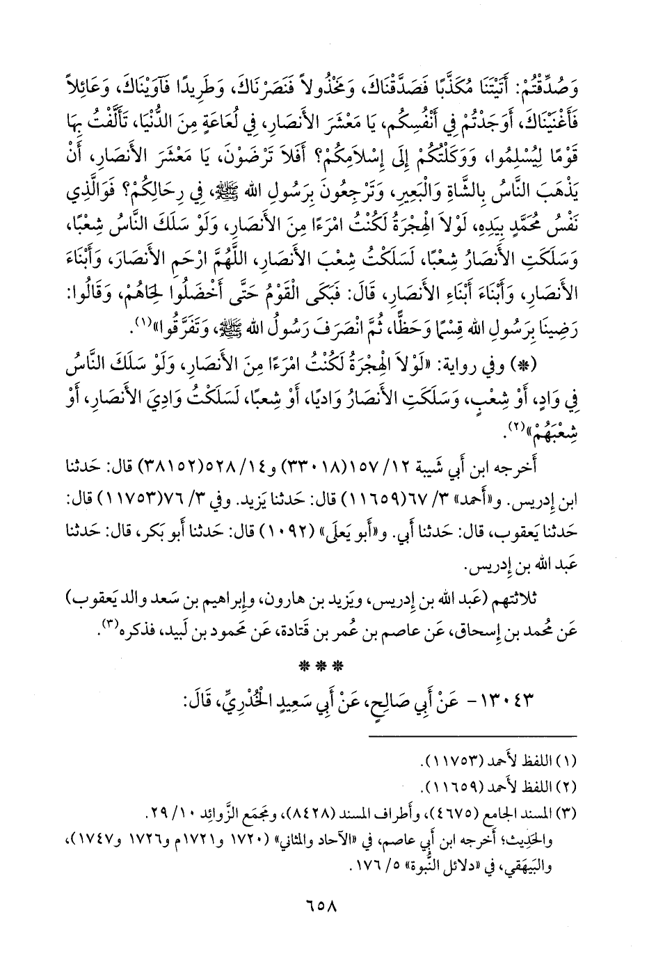 «اجتمع أناس من الأنصار، فقالوا: آثر علينا غيرنا، فبلغ ذلك النبي صَلى الله عَليه وسَلم فجمعهم، ثم خطبهم، فقال: يا معشر الأنصار، ألم تكونوا أذلة فأعزكم الله؟ قالوا: صدق الله ورسوله، قال: ألم تكونوا ضلالا فهداكم الله؟ قالوا: صدق الله ورسوله، قال: ألم تكونوا فقراء فأغناكم الله؟ قالوا: صدق الله ورسوله، ثم قال: ألا تجيبونني، ألا تقولون: أتيتنا طريدا فآويناك، وأتيتنا خائفا فأمناك، ألا ترضون أن يذهب الناس بالشاء والبقران، يعني البقر، وتذهبون برسول الله صَلى الله عَليه وسَلم فتدخلونه بيوتكم، لو أن الناس سلكوا واديا، أو شعبة، وسلكتم واديا، أو شعبة، لسلكت واديكم، أو شعبتكم، لولا الهجرة لكنت امرءا من الأنصار، وإنكم ستلقون بعدي أثرة، فاصبروا حتى تلقوني على الحوض» (¬١).