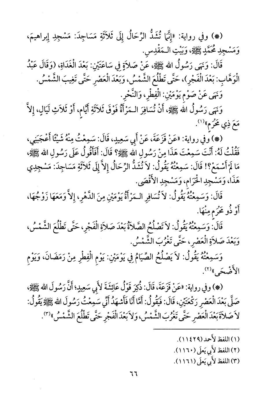 - وفي رواية: «لا تشد الرحال إلا إلى ثلاثة مساجد: مسجد الحرام، ومسجد المدينة، ومسجد الأقصى» (¬٣).