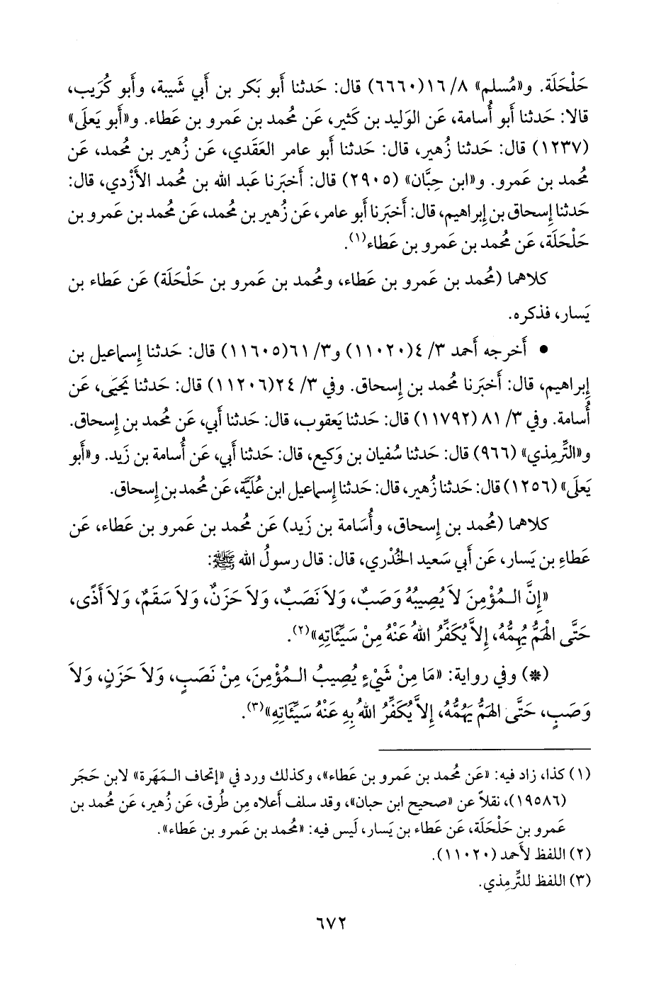 و «مسلم» ٨/ ١٦ (٦٦٦٠) قال: حدثنا أَبو بكر بن أبي شيبة، وأَبو كُريب، قالا: حدثنا أَبو أُسامة، عن الوليد بن كثير، عن محمد بن عَمرو بن عطاء. و «أَبو يَعلى» (١٢٣٧) قال: حدثنا زهير، قال: حدثنا أَبو عامر العَقَدي، عن زهير بن محمد، عن محمد بن عَمرو. و «ابن حِبَّان» (٢٩٠٥) قال: أخبرنا عبد الله بن محمد الأزدي، قال: حدثنا إسحاق بن إبراهيم، قال: أخبرنا أَبو عامر، عن زهير بن محمد، عن محمد بن عَمرو بن حلحلة، عن محمد بن عَمرو بن عطاء (¬١).