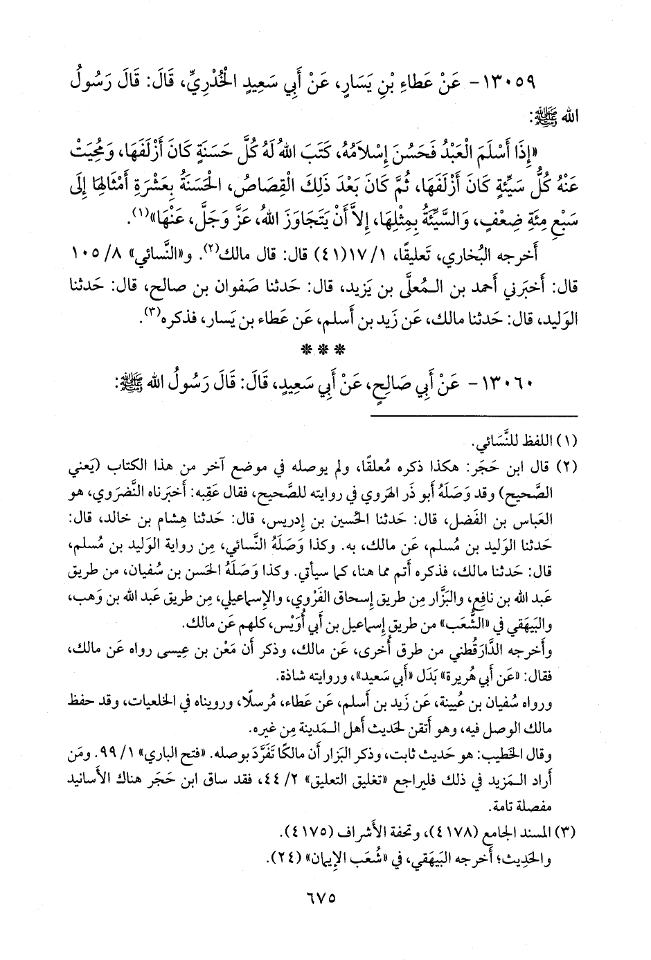 وأخرجه الدارقُطني من طرق أخرى، عن مالك، وذكر أن مَعن بن عيسى رواه عن مالك، فقال: «عن أبي هريرة» بدل «أبي سعيد»، وروايته شاذة, ورواه سفيان بن عُيينة، عن زيد بن أسلم، عن عطاء، مرسلا، ورويناه في الخلعيات، وقد حفظ مالك الوصل فيه، وهو أتقن لحديث أهل المدينة من غيره, وقال الخطيب: هو حديث ثابت، وذكر البزار أن مالكا تفرد بوصله. «فتح الباري» ١/ ٩٩.