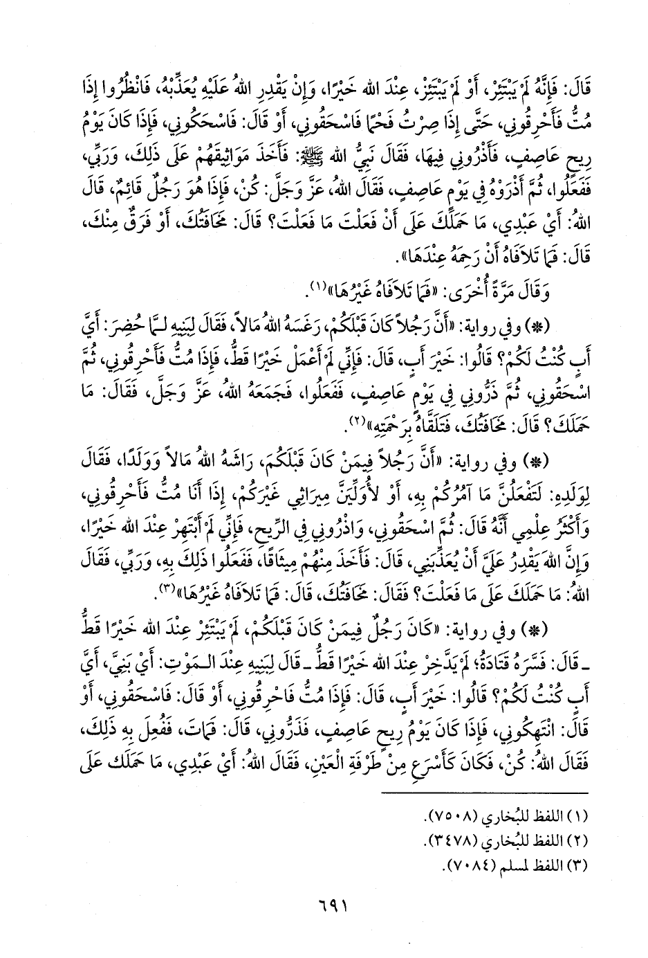 - وفي رواية: «كان رجل فيمن كان قبلكم، لم يبتئر عند الله خيرًا قط ـ قال: فسره قتادة؛ لم يدخر عند الله خيرًا قط ـ قال لبنيه عند الموت: أي بني، أي أب كنت لكم؟ قالوا: خير أب، قال: فإذا مت فاحرقوني، أو قال: فاسحقوني، أو قال: انتهكوني، فإذا كان يوم ريح عاصف، فذروني، قال: فمات، ففعل به ذلك، فقال الله: كن، فكان كأسرع من طرفة العين، فقال الله: أي عبدي، ما حملك على