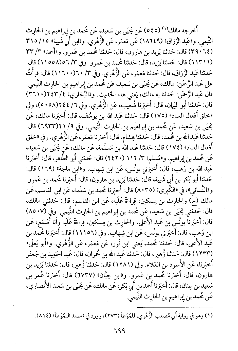 وفي ٦/ ١٩٧ (٥٠٥٨)، وفي «خلق أفعال العباد» (١٧٥) قال: حدثنا عبد الله بن يوسف، قال: أخبرنا مالك، عن يحيى بن سعيد، عن محمد بن إبراهيم بن الحارث التيمي. وفي ٩/ ١٧ (٦٩٣٣) قال: حدثنا عبد الله بن محمد، قال: حدثنا هشام، قال: أخبرنا مَعمَر، عن الزُّهْري. وفي «خلق أفعال العباد» (١٧٤) قال: حدثنا عبد الله بن مَسلَمة، عن مالك، عن يحيى بن سعيد، عن محمد بن إبراهيم. و «مسلم» ٣/ ١١٢ (٢٤٢٠) قال: حدثني أَبو الطاهر، قال: أخبرنا عبد الله بن وهب، قال: أخبرني يونس، عن ابن شهاب. و «ابن ماجة» (١٦٩) قال: حدثنا أَبو بكر بن أبي شيبة، قال: حدثنا يزيد بن هارون، قال: أخبرنا محمد بن عَمرو. و «النَّسَائي» في «الكبرى» (٨٠٣٥) قال: أخبرنا محمد بن سلمة، عن ابن القاسم، عن مالك (ح) والحارث بن مسكين، قراءة عليه، عن ابن القاسم، قال: حدثني مالك، قال: حدثني يحيى بن سعيد، عن محمد بن إبراهيم بن الحارث التيمي. وفي (٨٥٠٧) قال: أخبرنا يونس بن عبد الأعلى، والحارث بن مسكين، قراءة عليه وأنا أسمع، عن ابن وهب، قال: أخبرني يونس، عن ابن شهاب. وفي (١١١٥٦) قال: أخبرنا محمد بن عبد الأعلى، قال: حدثنا محمد، يعني ابن ثور، عن مَعمَر، عن الزُّهْري. و «أَبو يَعلى» (١٢٣٣) قال: حدثنا زهير، قال: حدثنا عبد الله بن حمران، قال: عبد الحميد بن جعفر أخبرنا، عن الأسود بن العلاء. وفي (١٢٨١) قال: حدثنا زهير، قال: حدثنا يزيد بن هارون، قال: أخبرنا محمد بن عَمرو. و «ابن حِبَّان» (٦٧٣٧) قال: أخبرنا عمر بن سعيد بن سنان، قال: أخبرنا أحمد بن أَبي بكر، عن مالك، عن يحيى بن سعيد الأَنصاري، عن محمد بن إبراهيم بن الحارث التيمي.