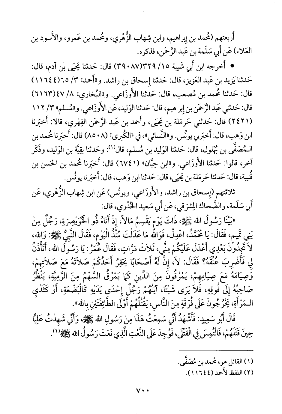 «بينا رسول الله صَلى الله عَليه وسَلم ذات يوم يقسم مالا، إذ أتاه ذو الخويصرة، رجل من بني تميم، فقال: يا محمد، اعدل، فوالله ما عدلت منذ اليوم، فقال النبي صَلى الله عَليه وسَلم: والله، لا تجدون بعدي أعدل عليكم مني، ثلاث مرات، فقال عمر: يا رسول الله، أتأذن لي فأضرب عنقه؟ فقال: لا، إن له أصحابا يحقر أحدكم صلاته مع صلاتهم، وصيامه مع صيامهم، يمرقون من الدين كما يمرق السهم من الرمية، ينظر صاحبه إلى فوقه، فلا يرى شيئا، آيتهم رجل إحدى يديه كالبضعة، أو كثدي المرأة، يخرجون على فرقة من الناس، يقتلهم أولى الطائفتين بالله».