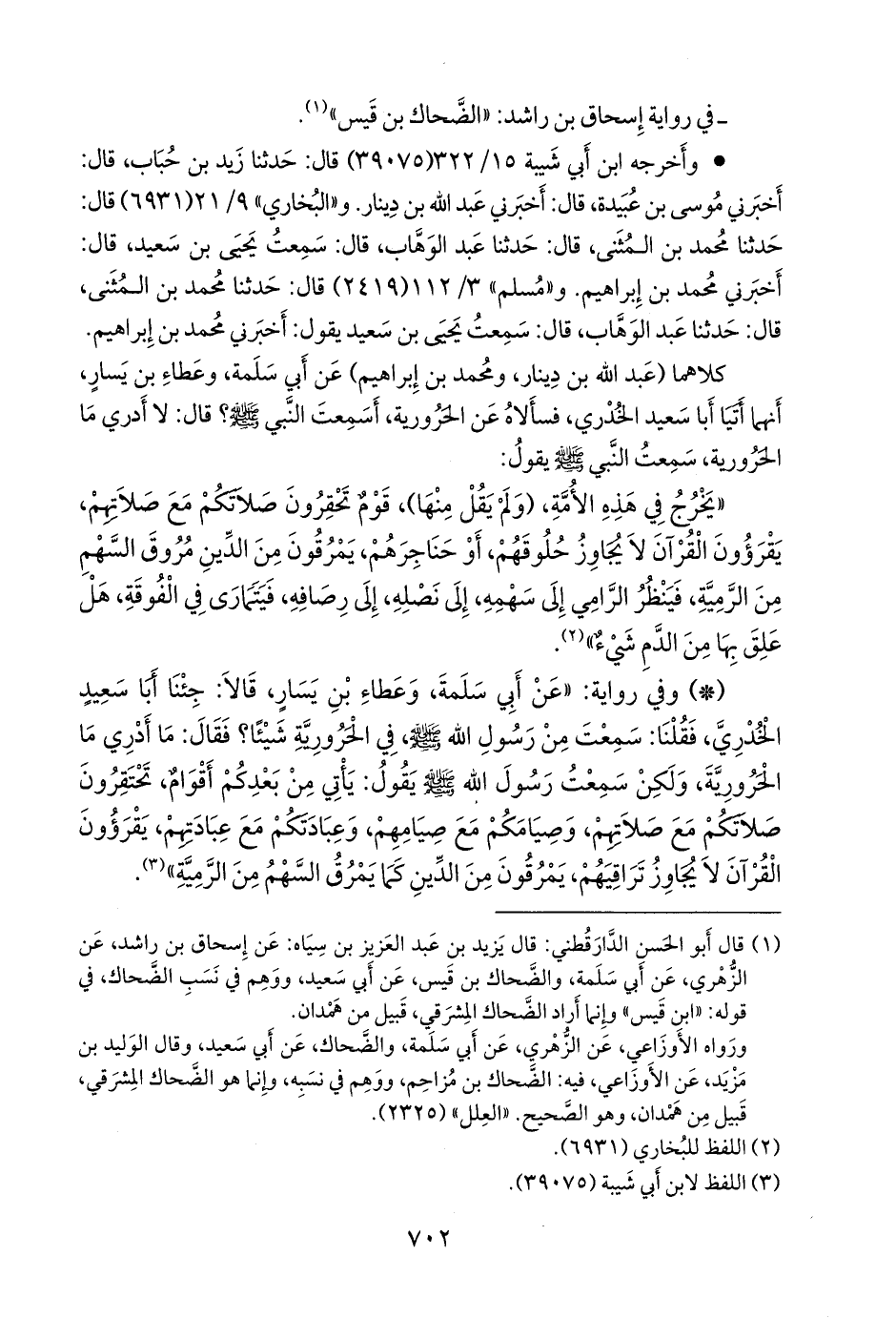 كلاهما (عبد الله بن دينار، ومحمد بن إبراهيم) عن أبي سلمة، وعطاء بن يسار، أنهما أتيا أبا سعيد الخُدْري، فسألاه عن الحرورية، أسمعت النبي صَلى الله عَليه وسَلم؟ قال: لا أدري ما الحرورية، سمعت النبي صَلى الله عَليه وسَلم يقول: