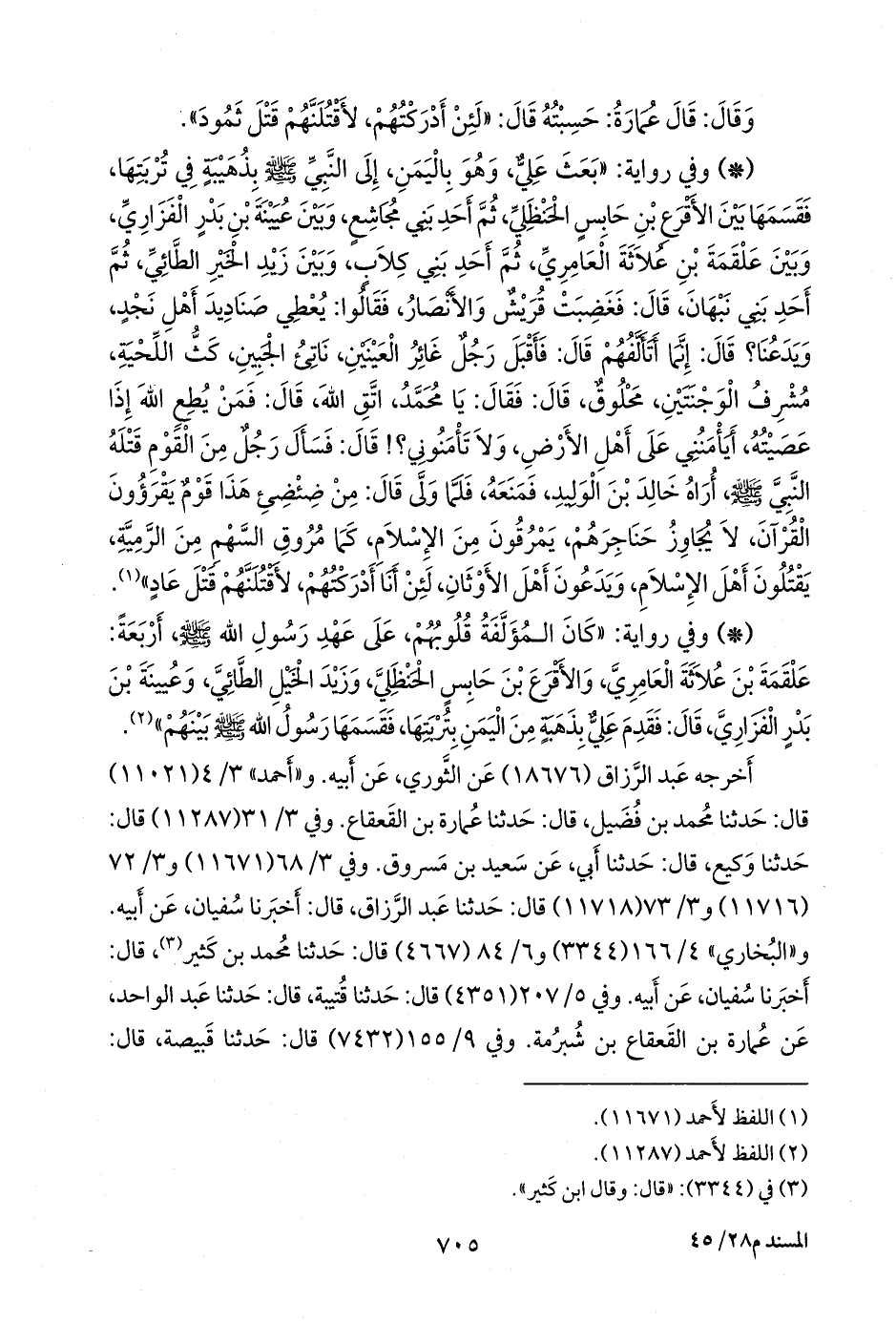 - وفي رواية: «كان المؤلفة قلوبهم، على عهد رسول الله صَلى الله عَليه وسَلم أربعة: علقمة بن علاثة العامري، والأقرع بن حابس الحنظلي، وزيد الخيل الطائي، وعُيينة بن بدر الفزاري، قال: فقدم علي بذهبة من اليمن بتربتها، فقسمها رسول الله صَلى الله عَليه وسَلم بينهم» (¬٢).