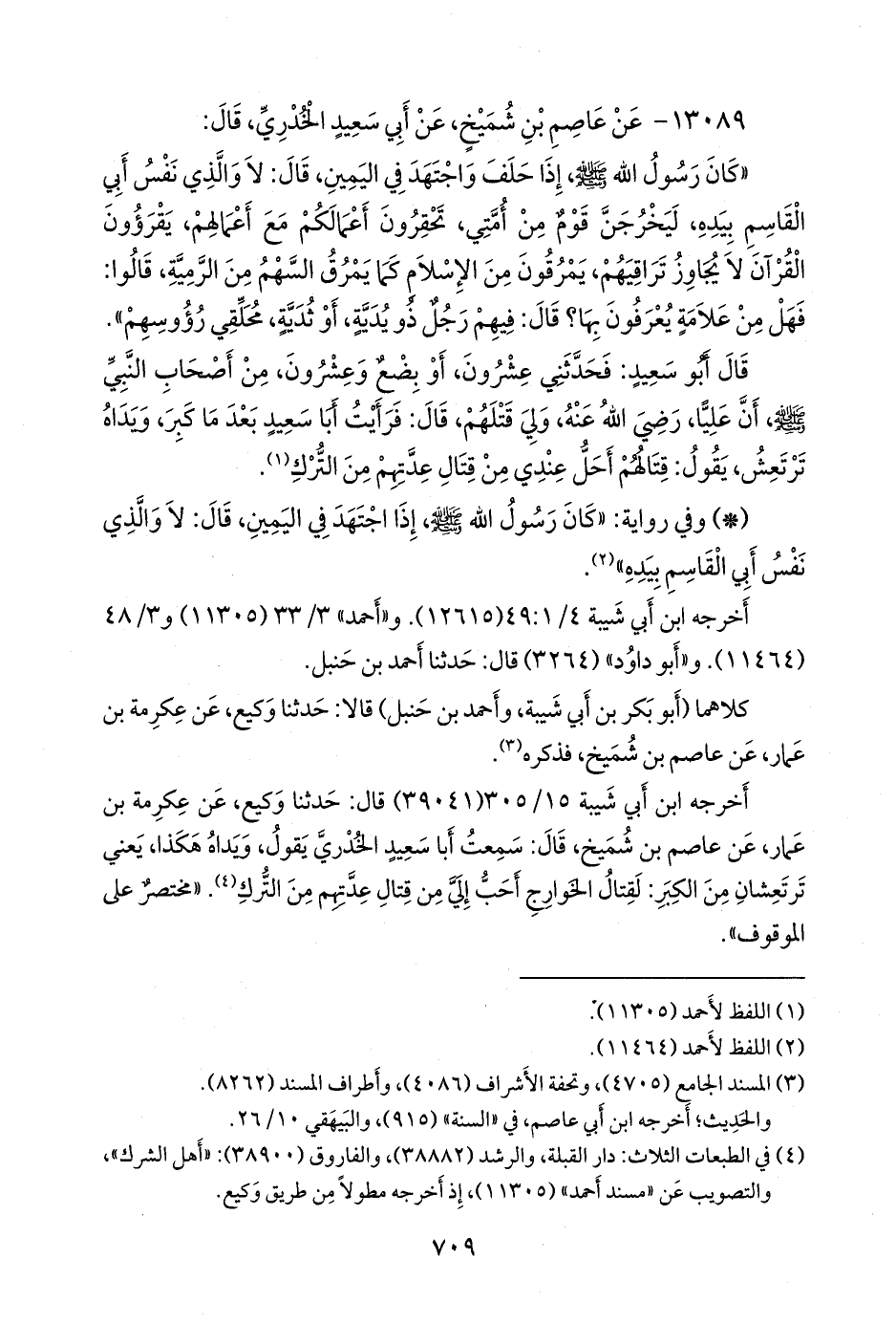 أخرجه ابن أبي شيبة (٣٩٠٤١) قال: حدثنا وكيع، عن عكرمة بن عمار، عن عاصم بن شميخ، قال: سمعت أبا سعيد الخُدْري يقول، ويداه هكذا، يعني ترتعشان من الكبر: لقتال الخوارج أحب إلي من قتال عدتهم من الترك (¬٤). «مختصر على الموقوف».