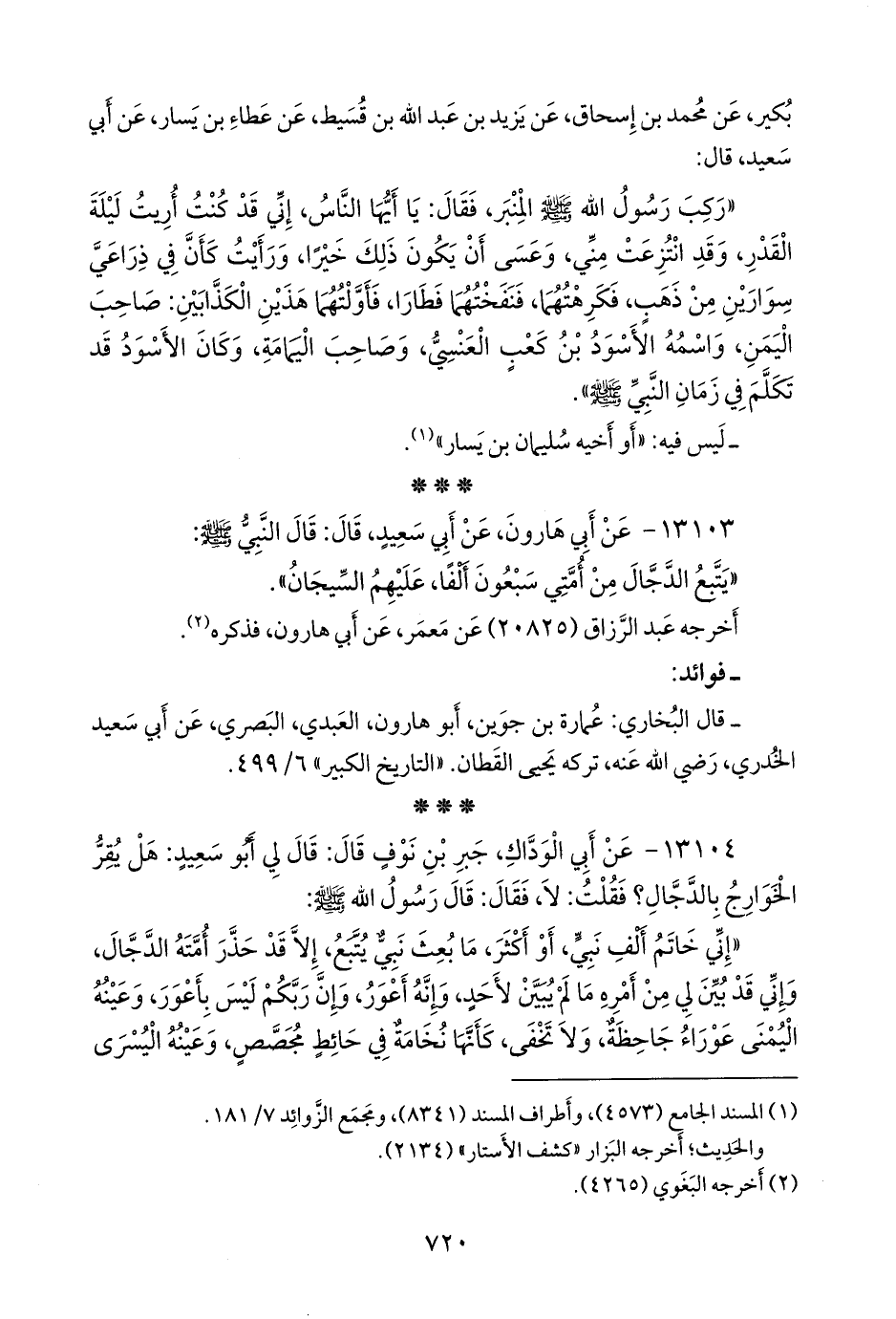 ١٣١٠٤ - عن أبي الوداك، جبر بن نوف قال: قال لي أَبو سعيد: هل يقر الخوارج بالدجال؟ فقلت: لا، فقال: قال رسول الله صَلى الله عَليه وسَلم: