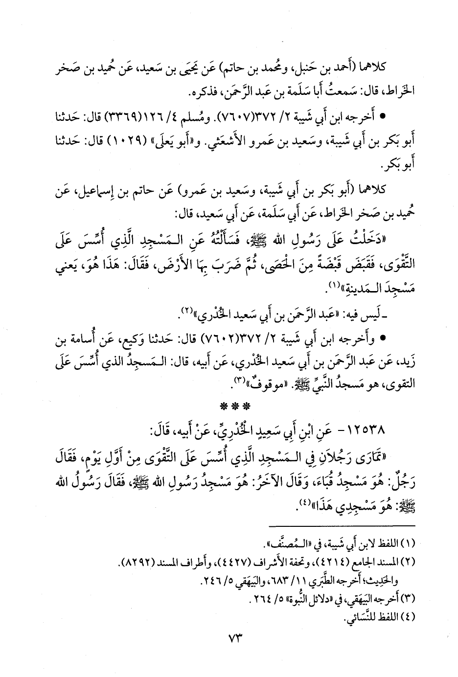 «تمارى رجلان في المسجد الذي أسس على التقوى من أول يوم، فقال رجل: هو مسجد قباء، وقال الآخر: هو مسجد رسول الله صَلى الله عَليه وسَلم فقال رسول الله صَلى الله عَليه وسَلم: هو مسجدي هذا» (¬١).