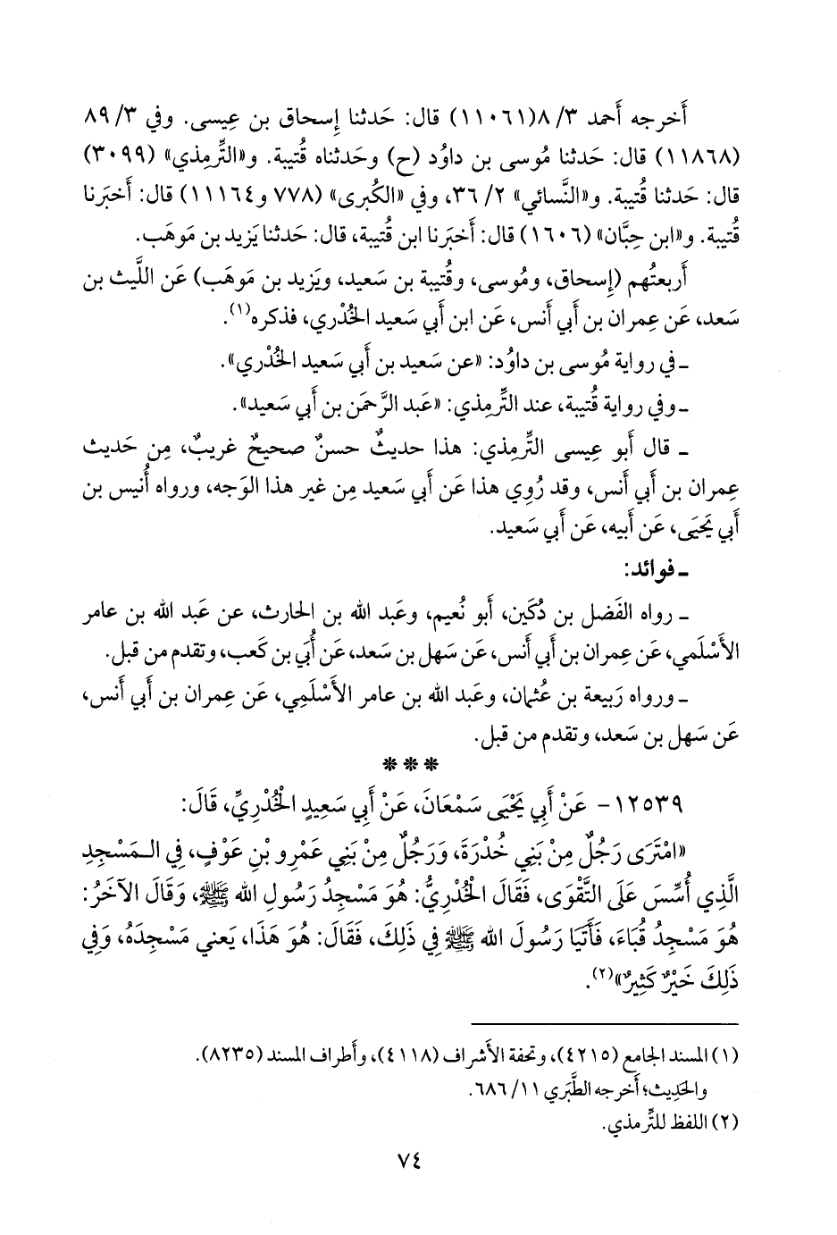«امترى رجل من بني خدرة، ورجل من بني عَمرو بن عوف، في المسجد الذي أسس على التقوى، فقال الخُدْري: هو مسجد رسول الله صَلى الله عَليه وسَلم وقال الآخر: هو مسجد قباء، فأتيا رسول الله صَلى الله عَليه وسَلم في ذلك، فقال: هو هذا، يعني مسجده، وفي ذلك خير كثير» (¬١).
