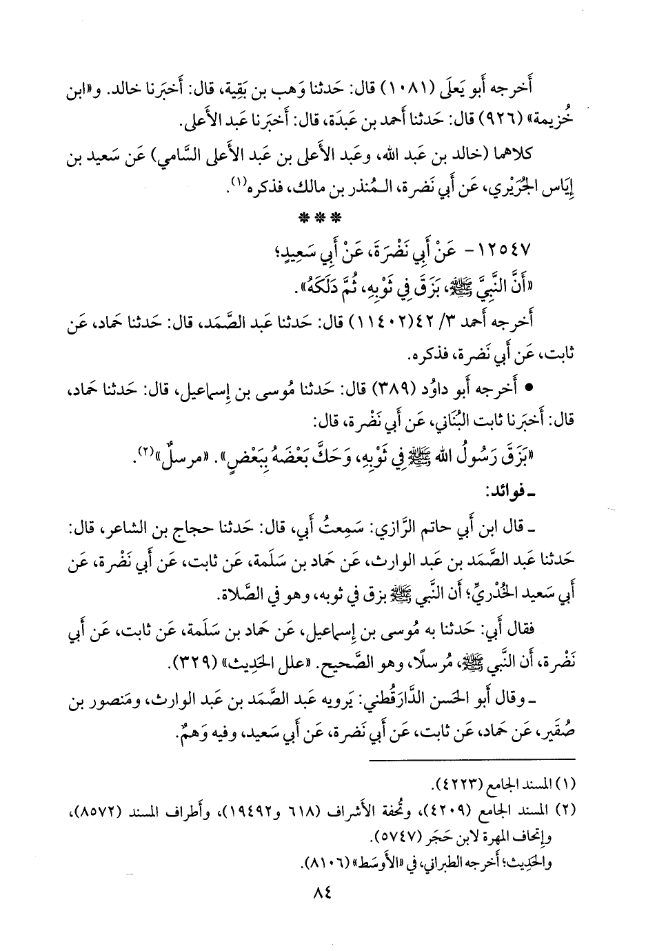 - قلنا: إِسناده ضعيفٌ؛ قال ابن أبي حاتم الرازي: سمعت أبي، قال: حدثنا حجاج بن الشاعر، قال: حدثنا عبد الصمد بن عبد الوارث، عن حماد بن سلمة، عن ثابت، عن أبي نضرة، عن أبي سعيد الخُدْري؛ أن النبي صَلى الله عَليه وسَلم بزق في ثوبه، وهو في الصلاة.