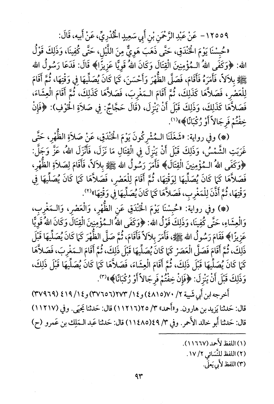 - وفي رواية: «حبسنا يوم الخندق عن الظهر، والعصر، والمغرب، والعشاء، حتى كفينا، وذلك قول الله: {وكفى الله المؤمنين القتال وكان الله قويا عزيزا} فقام رسول الله صَلى الله عَليه وسَلم فأمر بلالا فأقام، ثم صلى الظهر كما كان يصليها قبل ذلك، ثم أقام فصلى العصر كما كان يصليها قبل ذلك، ثم أقام المغرب، فصلاها كما كان يصليها قبل ذلك، ثم أقام العشاء، فصلاها كما كان يصليها قبل ذلك، وذلك قبل أن ينزل: {فإن خفتم فرجالا أو ركبانا}» (¬٣).