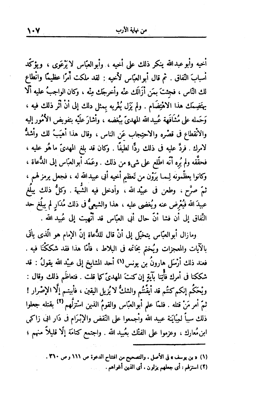 أخيه وأبو عبد الله ينكر ذلك على أخيه، وأبو العبّاس لا يرعوى، ويؤكّد أسباب النّفاق. ثم قال أبو العبّاس لأخيه: لقد ملكت أمرا عظيما وانطاع لك النّاس، فجئت بمن أزالك عنه وأخرجك منه، وكان الواجب عليه ألّا يهتضمك هذا الاهتضام. ولم يزل يغريه بمثل دلك إلى أن أثّر ذلك فيه، وحمله على مشافهة عبيد الله المهدىّ ببغضه، وأشار عليه بتفويض الأمور إليه والانقطاع فى قصره والاحتجاب عن الناس، وقال هذا أهيب لك وأشدّ لامرك. فردّ عليه فى ذلك ردّا لطيفا. وكان قد بلغ المهدىّ ما هو عليه، فحقّقه ولم يره أنّه اطّلع على شىء من ذلك. وعمد أبو العبّاس إلى الدّعاة، وكانوا يعظّمونه لما يرون من تعظيم أخيه أبى عبيد الله له، فجعل يرمز لهم، ثمّ صرّح، وطعن فى عبيد الله، وأدخل فيه الشّبهة. وكلّ ذلك يبلغ عبيد الله فيعرض عنه ويغضى عليه، هذا والشيعىّ فى ذلك مدار لم يبلغ حد النّفاق إلى أن فشا أنّ حال أبى العبّاس قد أنهيت إلى عبيد الله.