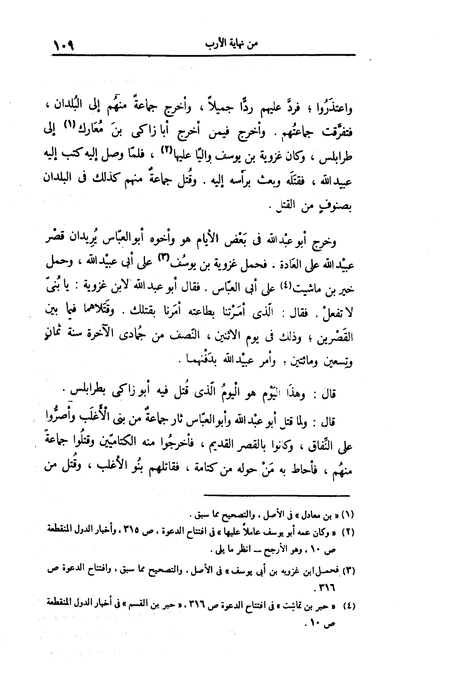 واعتذروا؛ فردّ عليهم ردّا جميلا، وأخرج جماعة منهم إلى البلدان، فتفرّقت جماعتهم. وأخرج فيمن أخرج أبا زاكى بن معارك «1» إلى طرابلس، وكان غزوية بن يوسف واليا عليها «2» ، فلمّا وصل إليه كتب إليه عبيد الله، فقتله وبعث برأسه إليه. وقتل جماعة منهم كذلك فى البلدان بصنوف من القتل.