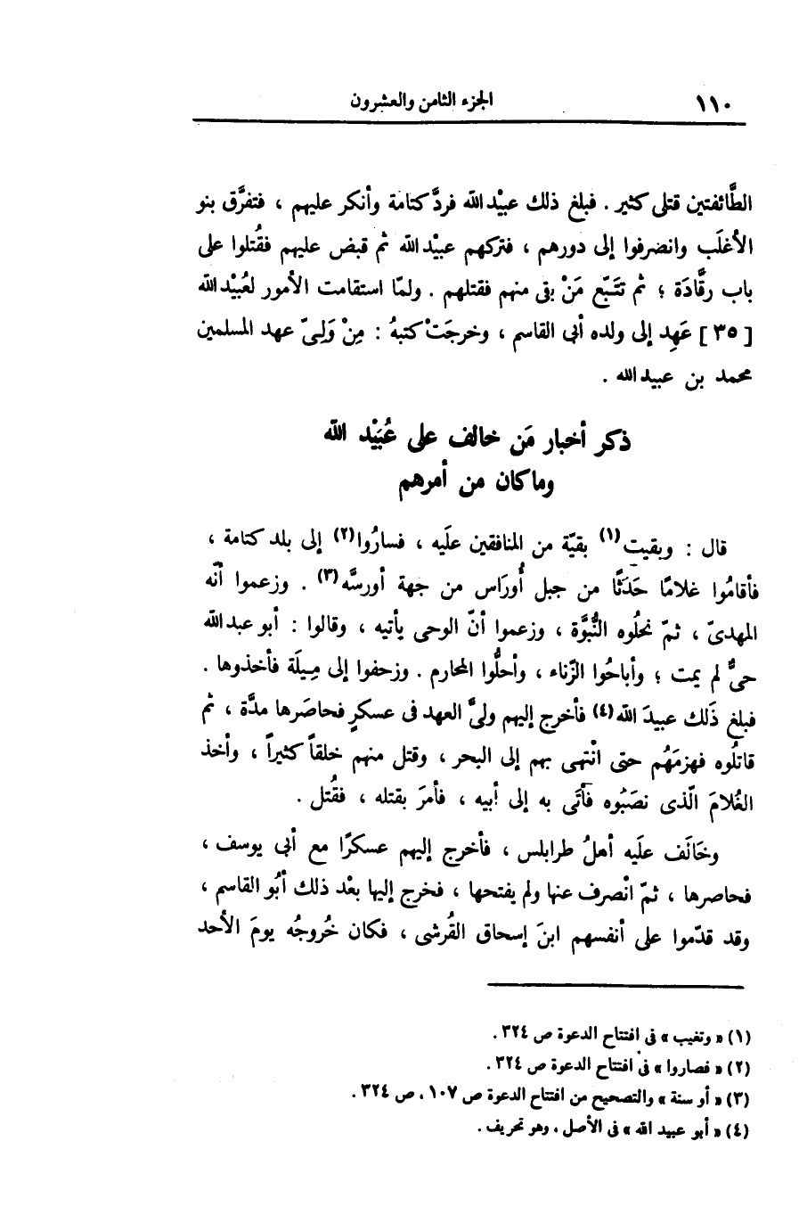 الطّائفتين قتلى كثير. فبلغ ذلك عبيد الله فردّ كتامة وأنكر عليهم، فتفرّق بنو الأغلب وانصرفوا إلى دورهم، فتركهم عبيد الله ثم قبض عليهم فقتلوا على باب رقّادة؛ ثم تتبّع من بقى منهم فقتلهم. ولمّا استقامت الأمور لعبيد الله [35] عهد إلى ولده أبى القاسم، وخرجت كتبه: من ولىّ عهد المسلمين محمد بن عبيد الله.