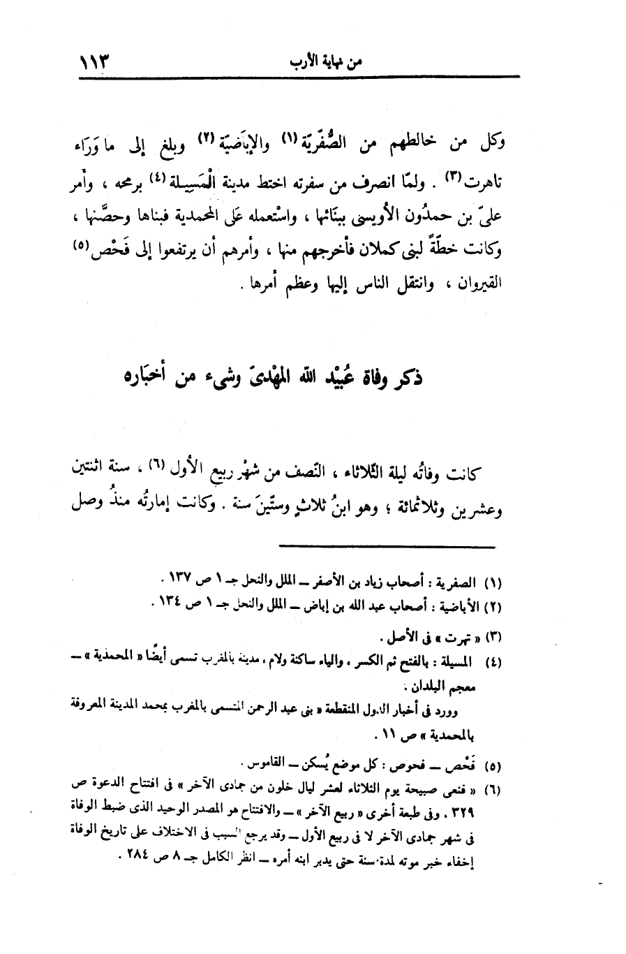 وكل من خالطهم من الصّفّريّة «1» والإباضيّة «2» وبلغ إلى ما وراء تاهرت «3» . ولمّا انصرف من سفرته اختط مدينة المسيلة «4» برمحه، وأمر علىّ بن حمدون الأويسى ببنائها، واستعمله على المحمدية فبناها وحصّنها، وكانت خطّة لبنى كملان فأخرجهم منها، وأمرهم أن يرتفعوا إلى فحص «5» القيروان، وانتقل الناس إليها وعظم أمرها.