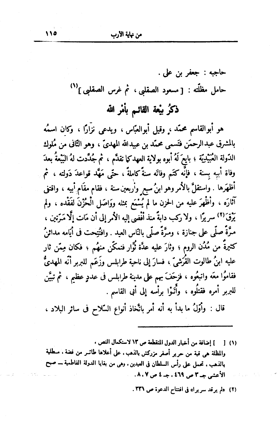 هو أبو القاسم محمّد، وقيل أبو العبّاس، ويدعى نزارا، وكان اسمه بالمشرق عبد الرحمن فتسمى محمّد بن عبيد الله المهدىّ، وهو الثّانى من ملوك الدّولة العبيديّة؛ بايع له أبوه بولاية العهد كما تقدّم، ثم جدّدت له البيعة بعد وفاة أبيه بسنة، فإنّه كتم وفاته سنة كاملة، حتّى مهّد قواعد دولته، ثم أظهرها. واستقلّ بالأمر وهو ابن سبع وأربعين سنة، فقام مقام أبيه، واقتفى آثاره، وأظهر عليه من الحزن ما لم يسمع بمثله وواصل الحزن لفقده، ولم يرق «2» سريرا، ولا ركب دابة منذ أفضى إليه الأمر إلى أن مات إلّا مرّتين، مرّة صلّى على جنازة، ومرّة صلّى بالنّاس العيد. وافتتحت فى أيامه مدائن كثيرة من مدن الروم؛ وثار عليه عدّة ثوّار فتمكّن منهم؛ فكان ممّن ثار عليه ابن طالوت القرشىّ، فسار إلى ناحية طرابلس وزعم للبربر أنّه المهدىّ فقاموا معه واتبعوه، فزحف بهم على مدينة طرابلس فى عدد عظيم، ثم تبيّن للبربر أمره فقتلوه، وأتوا برأسه إلى أبى القاسم.