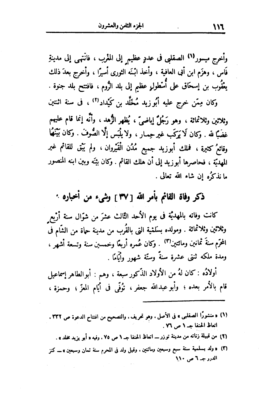 كانت وفاته بالمهديّة فى يوم الأحد الثّالث عشر من شوّال سنة أربع وثلاثين وثلاثمائة. ومولده بسلمية التى بالقرب من مدينة حماة من الشّام فى المحرّم سنة ثمانين ومائتين «3» . وكان عمره أربعا وخمسين سنة وتسعة أشهر، ومدة ملكه ثنتى عشرة سنة وستّة شهور وأيّاما.