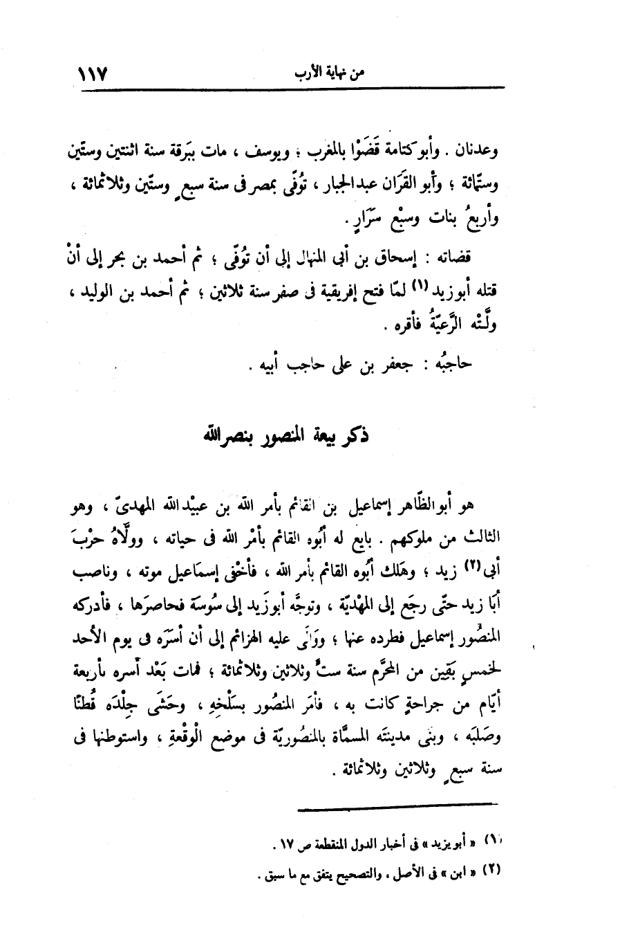 هو أبو الظّاهر إسماعيل بن القائم بأمر الله بن عبيد الله المهدىّ، وهو الثالث من ملوكهم. بايع له أبوه القائم بأمر الله فى حياته، وولّاه حرب أبى «2» زيد؛ وهلك أبوه القائم بأمر الله، فأخفى إسماعيل موته، وناصب أبا زيد حتّى رجع إلى المهديّة، وتوجّه أبو زيد إلى سوسة فحاصرها، فأدركه المنصور إسماعيل فطرده عنها؛ ووالى عليه الهزائم إلى أن أسره فى يوم الأحد لخمس بقين من المحرّم سنة ستّ وثلاثين وثلاثمائة؛ فمات بعد أسره بأربعة أيّام من جراحة كانت به، فأمر المنصور بسلخه، وحشى جلده قطنا وصلبه، وبنى مدينته المسمّاة بالمنصوريّة فى موضع الوقعة، واستوطنها فى سنة سبع وثلاثين وثلاثمائة.