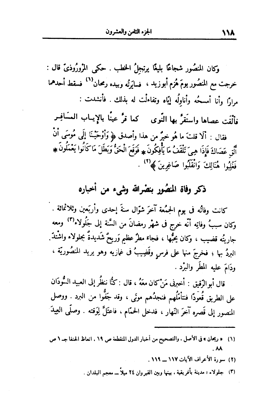 وكان سبب وفاته أنّه خرج فى شهر رمضان من السّنة إلى جلولاء «3» ومعه جاريته قضيب، وكان يحبّها، فجاء مطر عظيم وريح شديدة بجلولاء واشتدّ البرد بها؛ فخرج منها على فرس وقضيب فى غمازيه وهو يريد المنصوريّة، ودام عليه المطر والبرد.