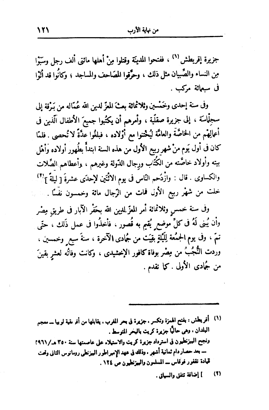 جزيرة إقريطش «1» ، ففتحوا المدينة وقتلوا من أهلها مائتى ألف رجل وسبوا من النساء والصّبيان مثل ذلك، وحرّقوا المصاحف والمساجد؛ وكانوا قد أتوا فى سبعمائة مركب.