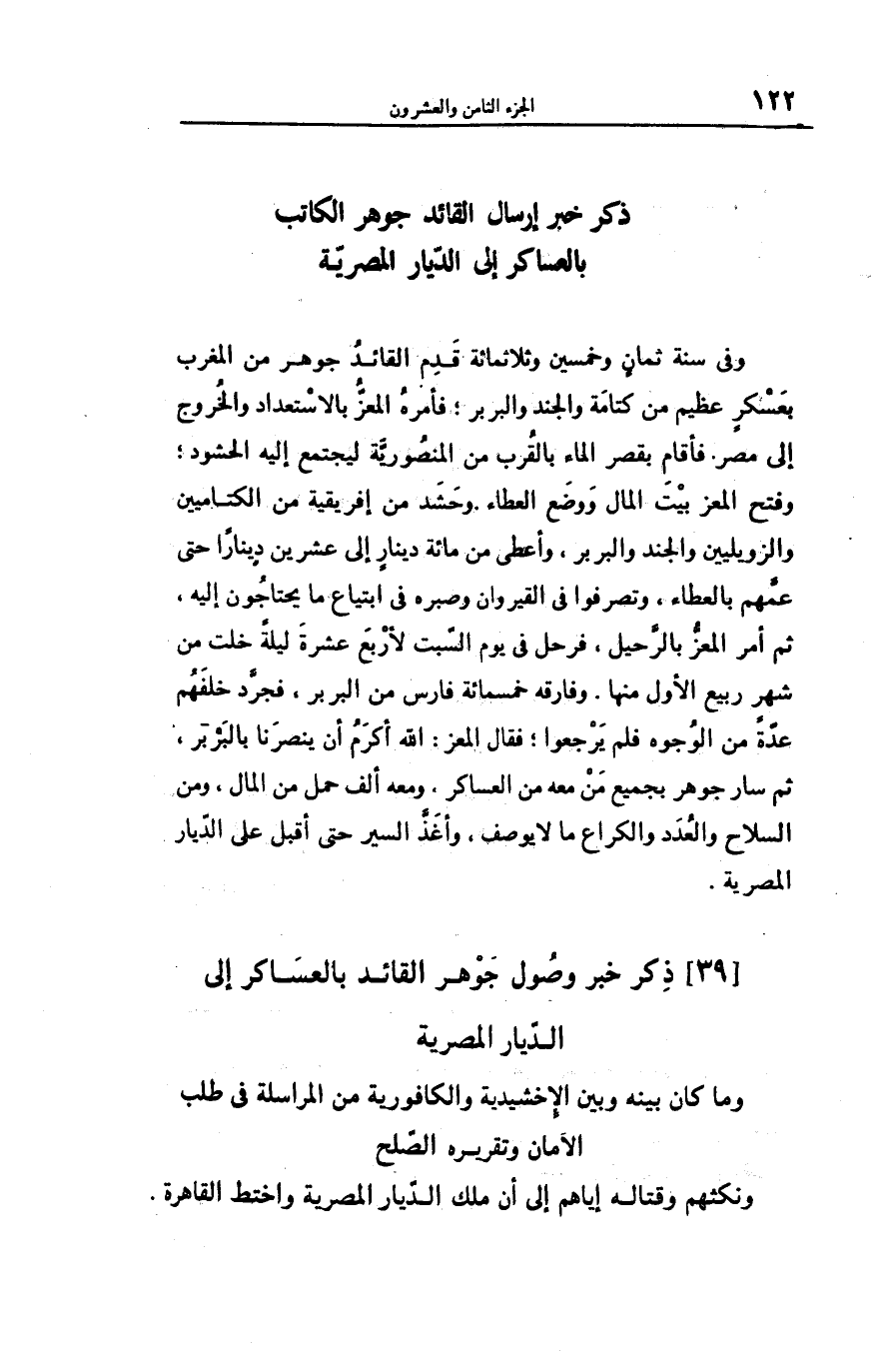[39] ذكر خبر وصول جوهر القائد بالعساكر إلى الدّيار المصرية وما كان بينه وبين الإخشيدية والكافورية من المراسلة فى طلب الآمان وتقريره الصّلح ونكثهم وقتاله إياهم إلى أن ملك الدّيار المصرية واختط القاهرة.