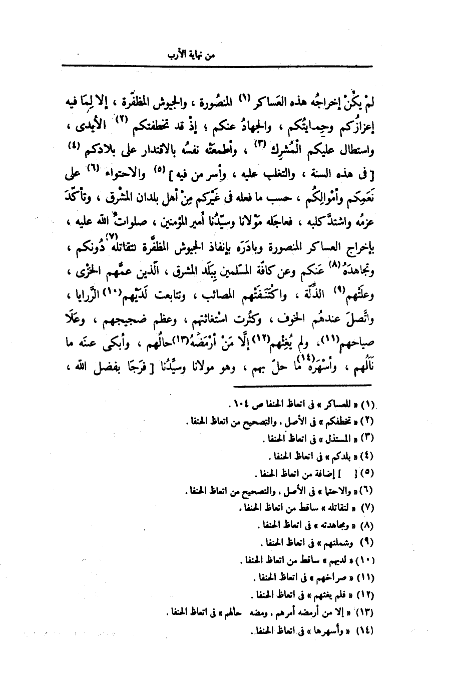 المنصورة، والجيوش المظفّرة، إلا لما فيه إعزازكم وحمايتكم، والجهاد عنكم؛ إذ قد تخطفتكم «2» الأيدى، واستطال عليكم المشرك «3» ، وأطمعته نفسه بالاقتدار على بلادكم «4» [فى هذه السنة، والتغلب عليه، وأسر من فيه] «5» والاحتواء «6» على نعمكم وأموالكم، حسب ما فعله فى غيركم من أهل بلدان المشرق، وتأكّد عزمه واشتدّ كلبه، فعاجله مولانا وسيّدنا أمير المؤمنين، صلوات الله عليه، بإخراج العساكر المنصورة وبادره بإنفاذ الجيوش المظفّرة لتقاتله «7» دونكم، وتجاهده «8» عنكم وعن كافّة المسّلمين ببلد المشرق، الّذين عمّهم الخزى، وعلتهم «9» الذّلّة، واكتنفتهم المصائب، وتتابعت لديهم «10»