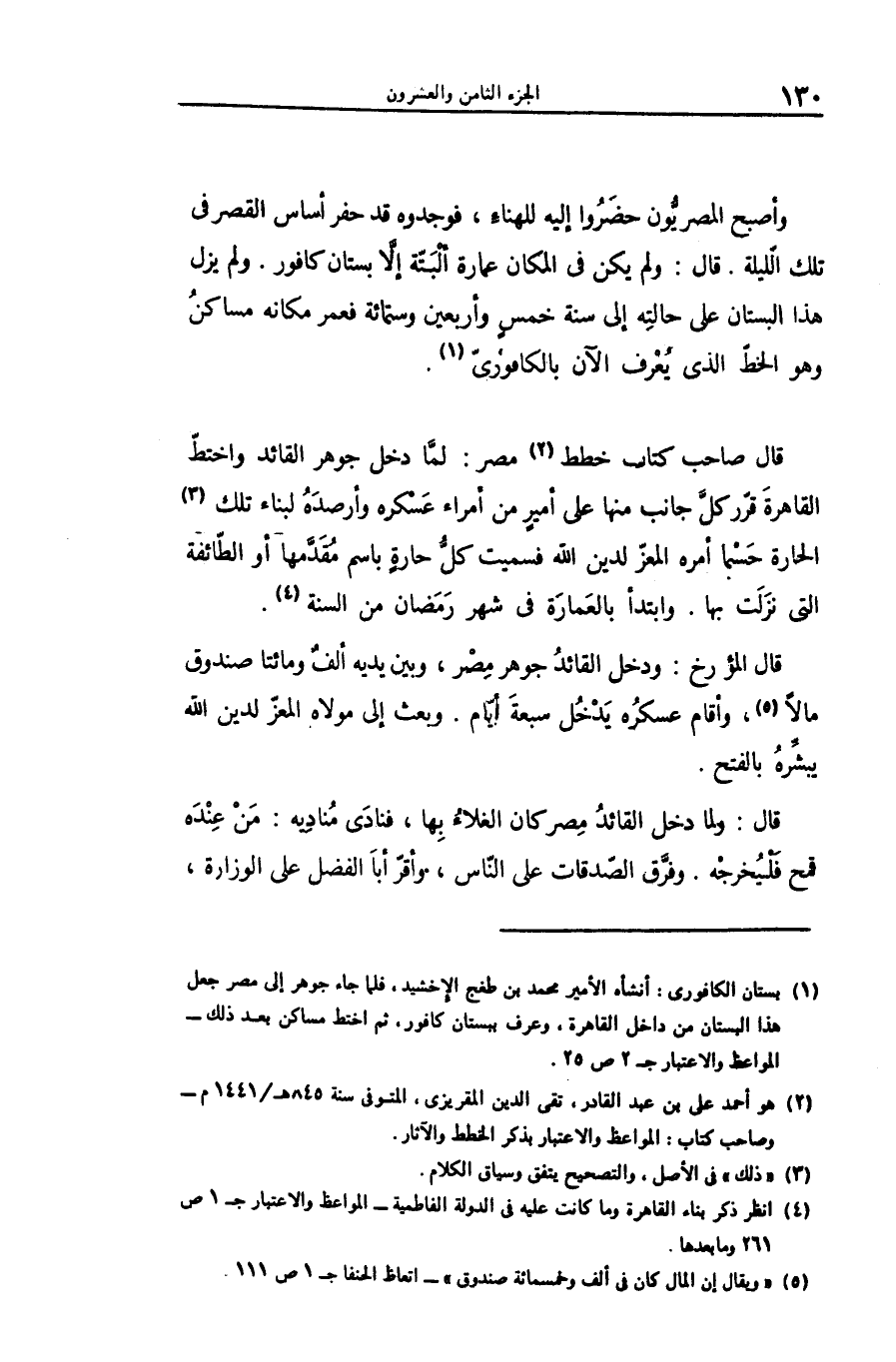 وأصبح المصريّون حضروا إليه للهناء، فوجدوه قد حفر أساس القصر فى تلك اللّيلة. قال: ولم يكن فى المكان عمارة ألبتّة إلّا بستان كافور. ولم يزل هذا البستان على حالته إلى سنة خمس وأربعين وستمائة فعمر مكانه مساكن وهو الخطّ الذى يعرف الآن بالكافورىّ «1» .
