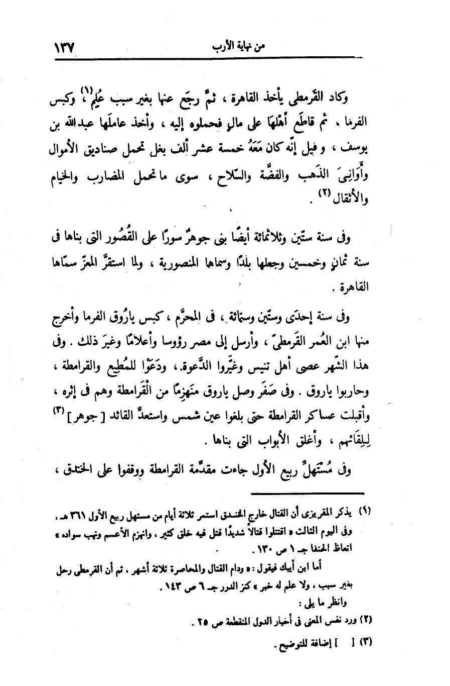 وكاد القرمطى يأخذ القاهرة، ثمّ رجع عنها بغير سبب عليم «1» ، وكبس الفرما، ثم قاطع أهلها على مال فحملوه إليه، وأخذ عاملها عبد الله بن يوسف، وقيل إنّه كان معه خمسة عشر ألف بغل تحمل صناديق الأموال وأوانى الذهب والفضّة والسّلاح، سوى ما تحمل المضارب والخيام والأثقال «2» .