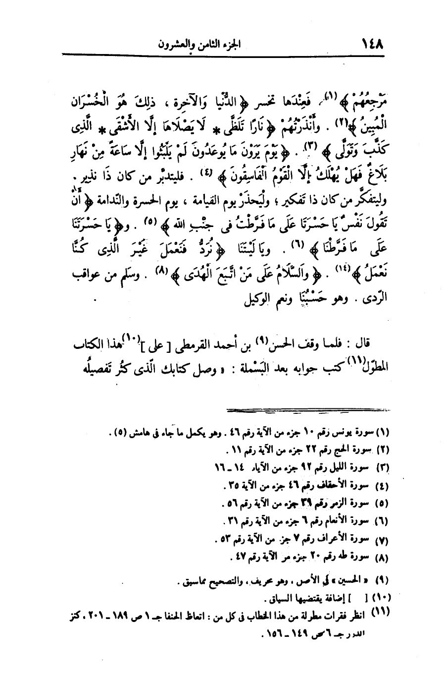 «8» . وسلم من عواقب الرّدى. وهو حسبنا ونعم الوكيل قال: فلما وقف الحسن «9» بن أحمد القرمطى [على] «10» هذا الكتاب المطوّل «11» كتب جوابه بعد البسملة: «وصل كتابك الّذى كثر تفصيله