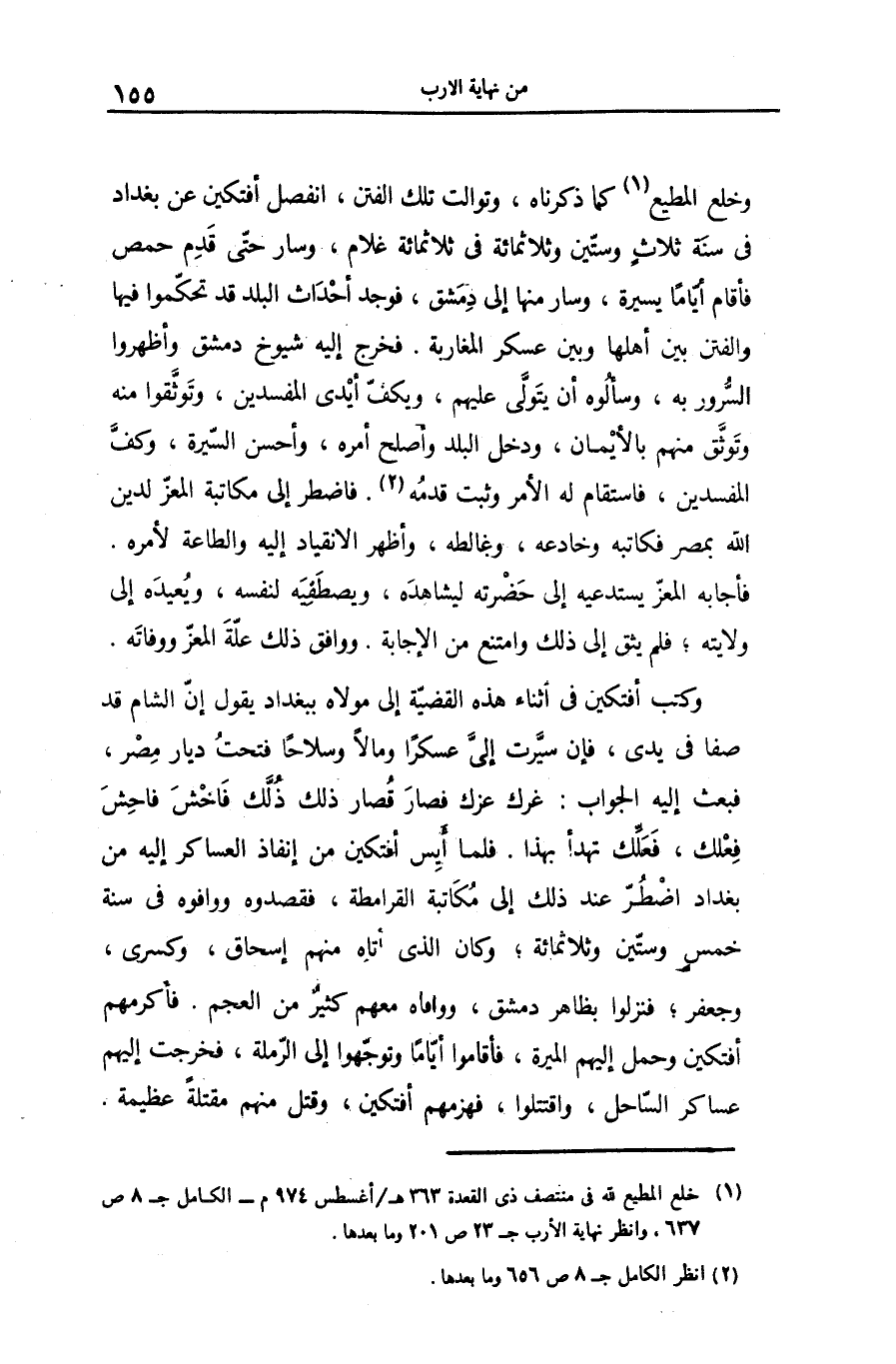 وخلع المطيع «1» كما ذكرناه، وتوالت تلك الفتن، انفصل أفتكين عن بغداد فى سنة ثلاث وستّين وثلاثمائة فى ثلاثمائة غلام، وسار حتّى قدم حمص فأقام أيّاما يسيرة، وسار منها إلى دمشق، فوجد أحداث البلد قد تحكّموا فيها والفتن بين أهلها وبين عسكر المغاربة. فخرج إليه شيوخ دمشق وأظهروا السّرور به، وسألوه أن يتولّى عليهم، ويكفّ أيدى المفسدين، وتوثّقوا منه وتوثّق منهم بالأيمان، ودخل البلد وأصلح أمره، وأحسن السّيرة، وكفّ المفسدين، فاستقام له الأمر وثبت قدمه «2» . فاضطر إلى مكاتبة المعزّ لدين الله بمصر فكاتبه وخادعه، وغالطه، وأظهر الانقياد إليه والطاعة لأمره.