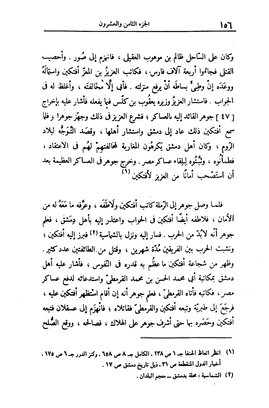 وكان على السّاحل ظالم بن موهوب العقيلى، فانهزم إلى صور. وأحصيت القتلى فجاءوا أربعة آلاف فارس، فكاتب العزيز بن المعزّ أفتكين واستماله ووعده إن وطئ بساطه أن يرفع منزلته. فأبى إلّا مخالفته، وأغلظ له فى الجواب. فاستشار العزيز وزيره يعقوب بن كلّس فيما يفعله فأشار عليه بإخراج [47] جوهر القائد إليه بالعساكر؛ فشرع العزيز فى ذلك وجهّز جوهرا، فلما سمع أفتكين ذلك عاد إلى دمشق واستشار أهلها، وقصد التّوجّه لبلاد الرّوم؛ وكان أهل دمشق يكرهون المغاربة لمخالفتهم لهم فى الاعتقاد، فطمأنوه، وثبّتوه للقاء عساكر مصر. وخرج جوهر فى العساكر العظيمة بعد أن استصحب أمانا من العزيز لأفتكين «1» فلما وصل جوهر إلى الرّملة كاتب أفتكين ولاطفه، وعرّفه ما معه له من الأمان؛ فلاطفه أيضا أفتكين فى الجواب واعتذر إليه بأهل دمشق، فعلم جوهر أنّه لا بدّ من الحرب. فسار إليه ونزل بالشماسية «2» فبرز إليه أفتكين؛ ونشبت الحرب بين الفريقين مدّة شهرين، وقتل من الطائفتين عدد كثير.