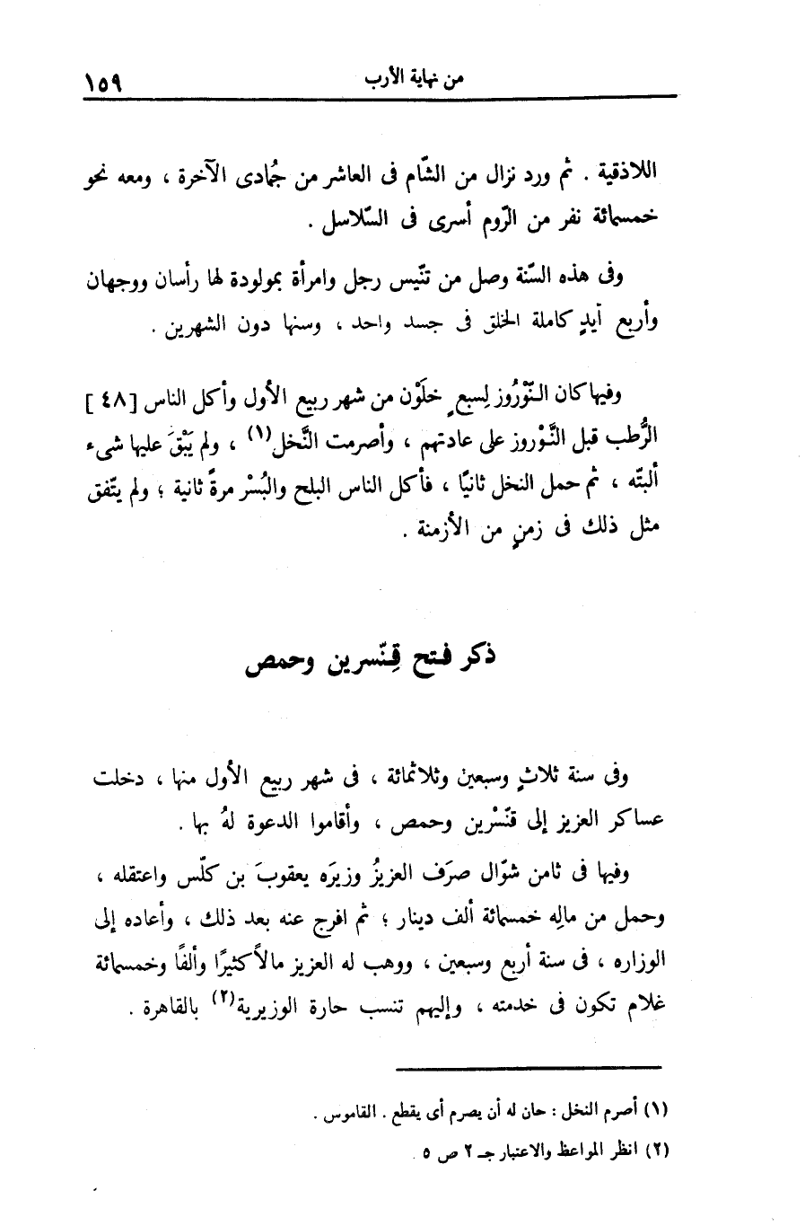 وفيها كان النّوروز لسبع خلون من شهر ربيع الأول وأكل الناس [48] الرّطب قبل النّوروز على عادتهم، وأصرمت النّخل «1» ، ولم يبق عليها شىء ألبتّه، ثم حمل النخل ثانيا، فأكل الناس البلح والبسر مرة ثانية؛ ولم يتّفق مثل ذلك فى زمن من الأزمنة.