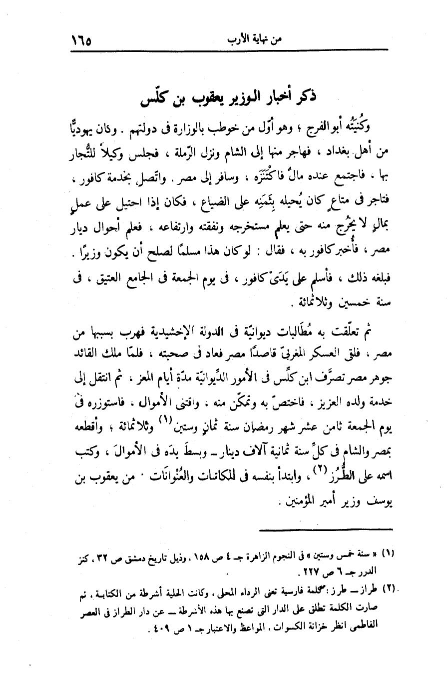 ثم تعلّقت به مطالبات ديوانيّة فى الدولة الإخشيدية فهرب بسببها من مصر، فلقى العسكر المغربىّ قاصدا مصر فعاد فى صحبته، فلمّا ملك القائد جوهر مصر تصرّف ابن كلّس فى الأمور الدّيوانيّة مدّة أيام المعز، ثم انتقل إلى خدمة ولده العزيز، فاختصّ به وتمكّن منه، واقتنى الأموال، فاستوزره فى يوم الجمعة ثامن عشر شهر رمضان سنة ثمان وستين «1» وثلاثمائة؛ وأقطعه بمصر والشام فى كلّ سنة ثمانية آلاف دينار- وبسط يده فى الأموال، وكتب اسمه على الطّرز «2» ، وابتدأ بنفسه فى المكاتبات والعنوانات. من يعقوب بن يوسف وزير أمير المؤمنين.