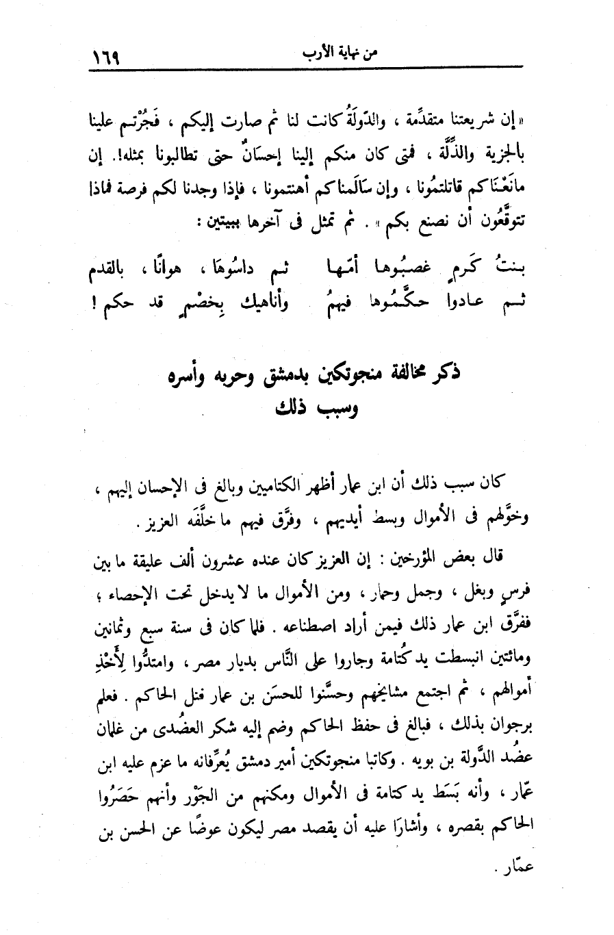 «إن شريعتنا متقدّمة، والدّولة كانت لنا ثم صارت إليكم، فجرتم علينا بالجزية والذّلّة، فمتى كان منكم إلينا إحسان حتى تطالبونا بمثله!. إن ما نعناكم قاتلتمونا، وإن سالمناكم أهنتمونا، فإذا وجدنا لكم فرصة فماذا تتوقّعون أن نصنع بكم» . ثم تمثل فى آخرها ببيتين: