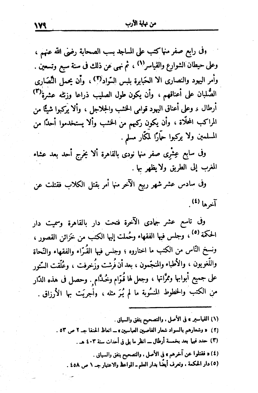 وأمر اليهود والنصارى الا الحبابرة بلبس السّواد «2» ، وأن يحمل النّصارى الصّلبان على أعناقهم، وأن يكون طول الصليب ذراعا وزنته عشرة «3» أرطال، وعلى أعناق اليهود قوامى الخشب والجلاجل، وألا يركبوا شيئا من المراكب المحلّاة، وأن يكون ركبهم من الخشب وألا يستخدموا أحدا من المسلمين ولا يركبوا حمارا لمكّار مسلم.