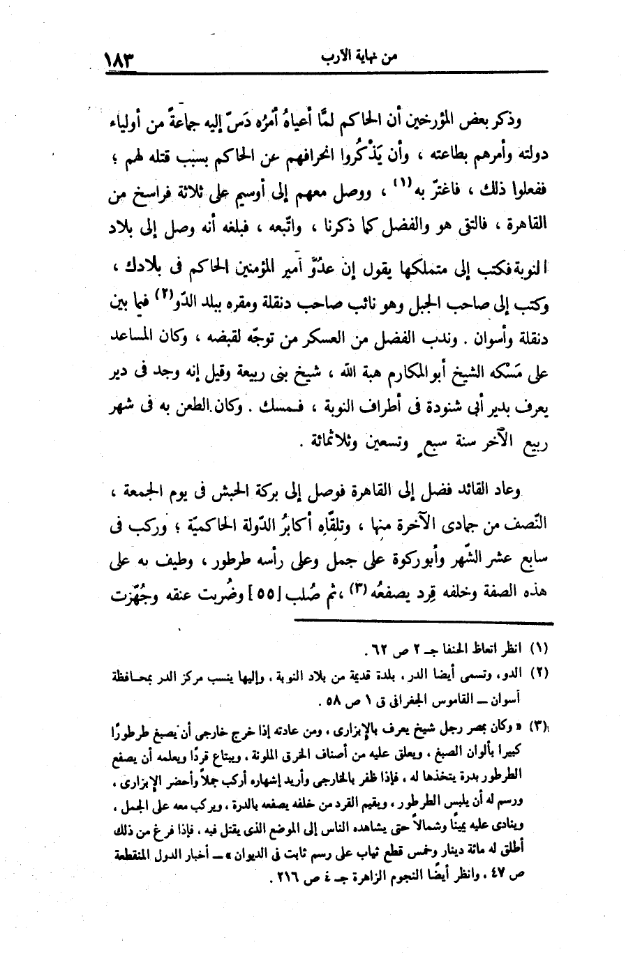 وذكر بعض المؤرخين أن الحاكم لمّا أعياه أمره دسّ إليه جماعة من أولياء دولته وأمرهم بطاعته، وأن يذكروا انحرافهم عن الحاكم بسبب قتله لهم؛ ففعلوا ذلك، فاغترّ به «1» ، ووصل معهم إلى أوسيم على ثلاثة فراسخ من القاهرة، فالتقى هو والفضل كما ذكرنا، واتّبعه، فبلغه أنه وصل إلى بلاد النوبة فكتب إلى متملكها يقول إن عدوّ أمير المؤمنين الحاكم فى بلادك، وكتب إلى صاحب الجبل وهو نائب صاحب دنقلة ومقره ببلد الدّو «2» فيما بين دنقلة وأسوان. وندب الفضل من العسكر من توجّه لقبضه، وكان المساعد على مسكه الشيخ أبو المكارم هبة الله، شيخ بنى ربيعة وقيل إنه وجد فى دير يعرف بدير أبى شنودة فى أطراف النوبة، فمسك. وكان الطعن به فى شهر ربيع الآخر سنة سبع وتسعين وثلاثمائة.
