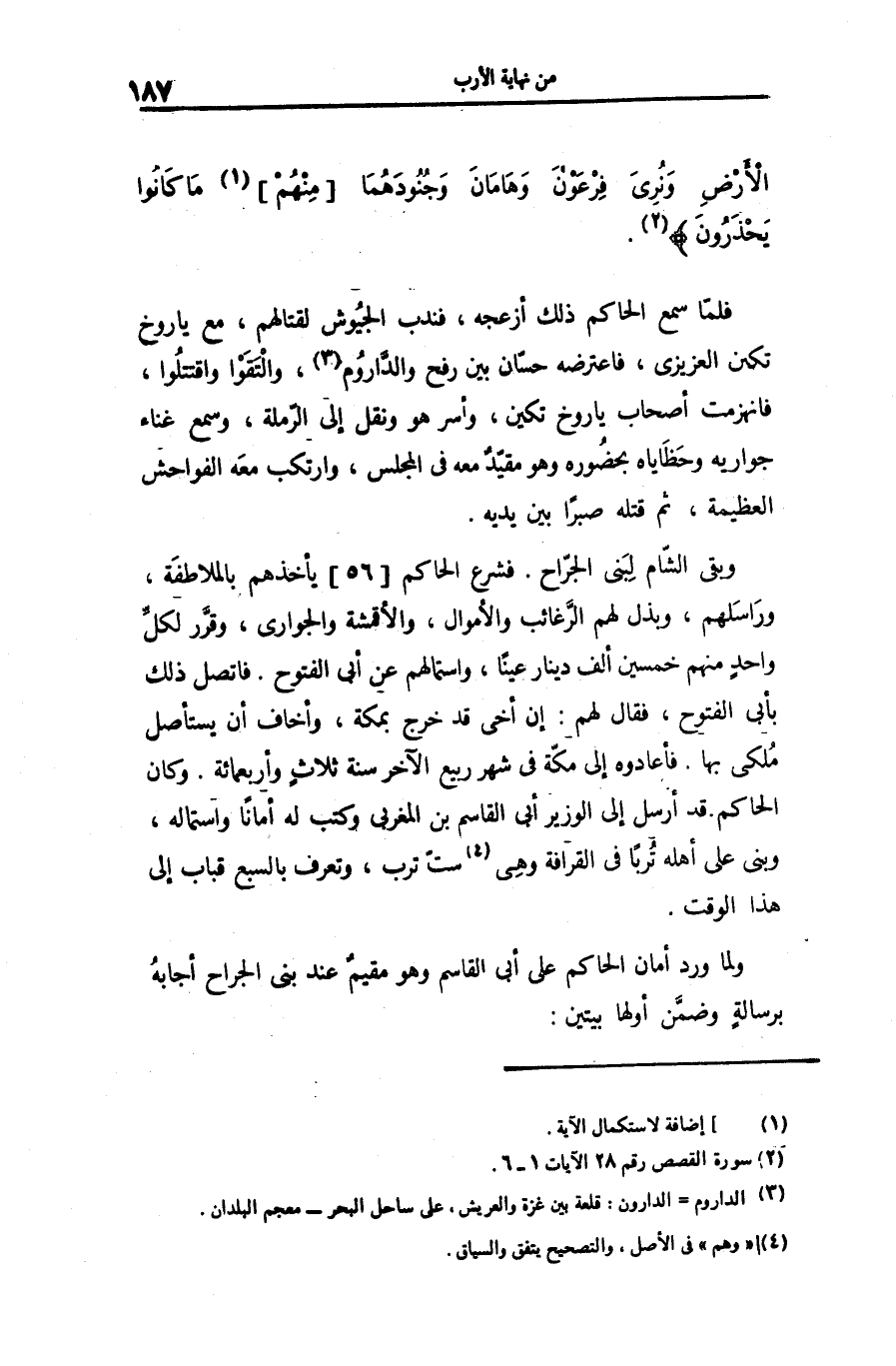 فلمّا سمع الحاكم ذلك أزعجه، فندب الجيوش لقتالهم، مع ياروخ تكين العزيزى، فاعترضه حسّان بين رفح والدّاروم «3» ، والتقوا واقتتلوا، فانهزمت أصحاب ياروخ تكين، وأسر هو ونقل إلى الرّملة، وسمع غناء جواريه وحظاياه بحضوره وهو مقيّد معه فى المجلس، وارتكب معه الفواحش العظيمة، ثم قتله صبرا بين يديه.