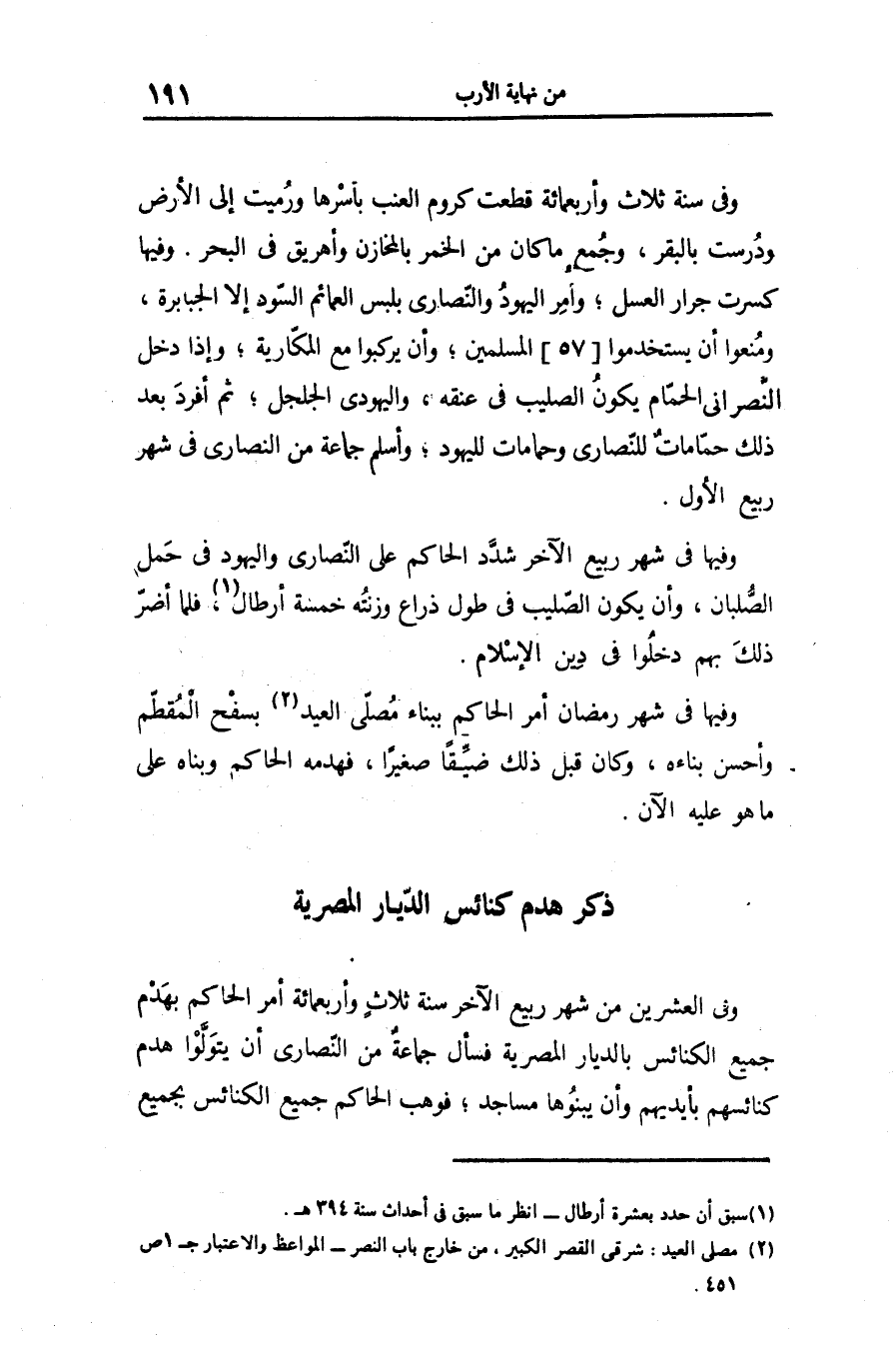 وفى سنة ثلاث وأربعمائة قطعت كروم العنب بأسرها ورميت إلى الأرض ودرست بالبقر، وجمع ما كان من الخمر بالمخازن وأهريق فى البحر. وفيها كسرت جرار العسل؛ وأمر اليهود والنّصارى بلبس العمائم السّود إلا الجبابرة، ومنعوا أن يستخدموا [57] المسلمين؛ وأن يركبوا مع المكّارية؛ وإذا دخل النّصرانى الحمّام يكون الصليب فى عنقه، واليهودى الجلجل؛ ثم أفرد بعد ذلك حمّامات للنّصارى وحمامات لليهود؛ وأسلم جماعة من النصارى فى شهر ربيع الأول.