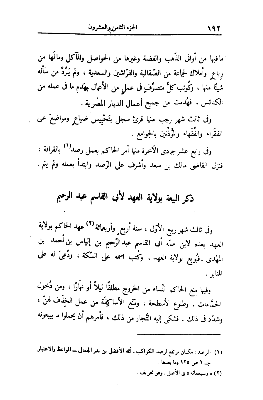وفى ثالث شهر رجب منها قرئ سجل بتحبيس ضياع ومواضع على الفقراء والفقهاء والمؤذّنين بالجوامع.
