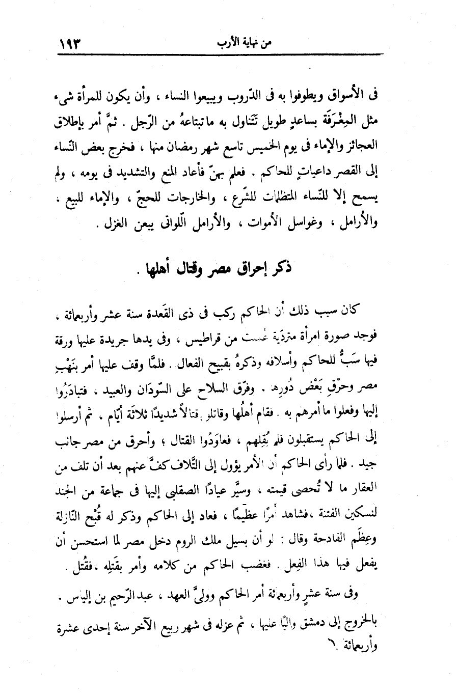 فى الأسواق ويطوفوا به فى الدّروب ويبيعوا النساء، وأن يكون للمرأة شىء مثل المغرفة بساعد طويل تتناول به ما تبتاعه من الرّجل. ثمّ أمر بإطلاق العجائز والإماء فى يوم الخميس تاسع شهر رمضان منها، فخرج بعض النّساء إلى القصر داعيات للحاكم، فعلم بهنّ فأعاد المنع والتشديد فى يومه، ولم يسمح إلا للنّساء المتظلمات للشّرع، والخارجات للحجّ، والإماء للبيع، والأرامل، وغواسل الأموات، والأرامل اللّواتى يبعن الغزل.
