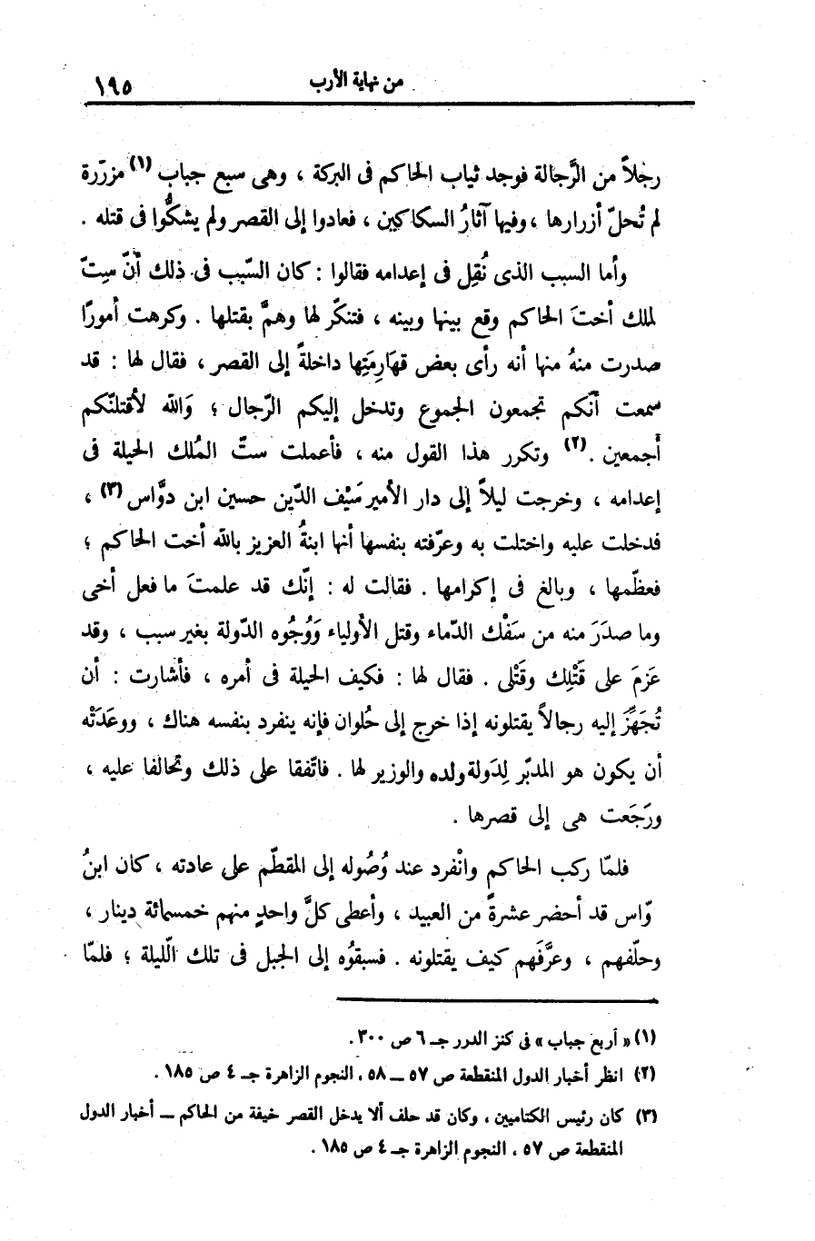 وأما السبب الذى نقل فى إعدامه فقالوا: كان السّبب فى ذلك أنّ ستّ لملك أخت الحاكم وقع بينها وبينه، فتنكّر لها وهمّ بقتلها. وكرهت أمورا صدرت منه منها أنه رأى بعض قهارمتها داخلة إلى القصر، فقال لها: قد سمعت أنّكم تجمعون الجموع وتدخل إليكم الرّجال؛ والله لأقتلنّكم أجمعين. «2» وتكرر هذا القول منه، فأعملت ستّ الملك الحيلة فى إعدامه، وخرجت ليلا إلى دار الأمير سيف الدّين حسين ابن دوّاس «3» ، فدخلت عليه واختلت به وعرّفته بنفسها أنها ابنة العزيز بالله أخت الحاكم؛ فعظّمها، وبالغ فى إكرامها. فقالت له: إنّك قد علمت ما فعل أخى وما صدر منه من سفك الدّماء وقتل الأولياء ووجوه الدّولة بغير سبب، وقد عزم على قتلك وقتلى. فقال لها: فكيف الحيلة فى أمره، فأشارت: أن تجهّز إليه رجالا يقتلونه إذا خرج إلى حلوان فإنه ينفرد بنفسه هناك، ووعدته أن يكون هو المدبّر لدولة ولده والوزير لها. فاتّفقا على ذلك وتحالفا عليه، ورجعت هى إلى قصرها.