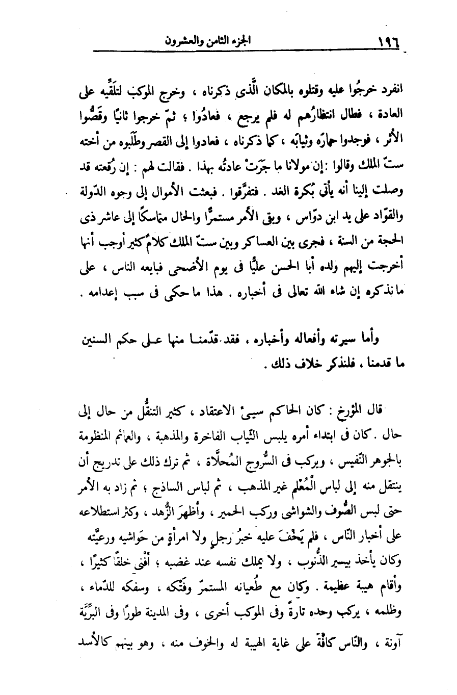 انفرد خرجوا عليه وقتلوه بالمكان الّذى ذكرناه، وخرج الموكب لتلقّيه على العادة، فطال انتظارهم له فلم يرجع، فعادوا؛ ثمّ خرجوا ثانيا وقصّوا الأثر، فوجدوا حماره وثيابه، كما ذكرناه، فعادوا إلى القصر وطلبوه من أخته ستّ الملك وقالوا: إن مولانا ما جرت عادته بهذا. فقالت لهم: إن رقعته قد وصلت إلينا أنه يأتى بكرة الغد. فتفرّقوا. فبعثت الأموال إلى وجوه الدّولة والقوّاد على يد ابن دوّاس، وبقى الأمر مستمرّا والحال متماسكا إلى عاشر ذى الحجة من السنة، فجرى بين العساكر وبين ستّ الملك كلام كثير أوجب أنها أخرجت إليهم ولده أبا الحسن عليّا فى يوم الأضحى فبايعه الناس، على ما نذكره إن شاء الله تعالى فى أخباره، هذا ما حكى فى سبب إعدامه.