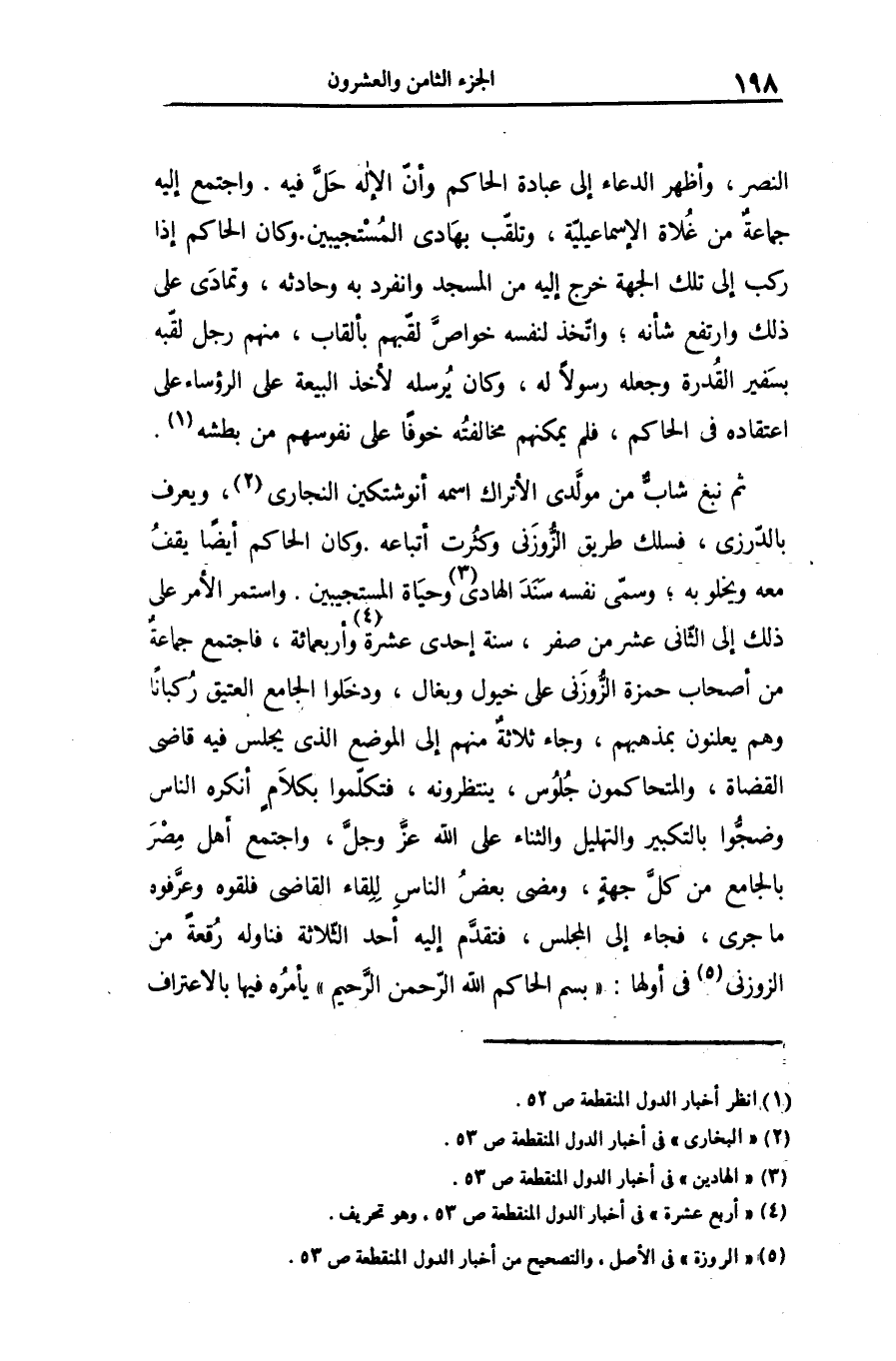 ثم نبغ شابّ من مولّدى الأتراك اسمه أنوشتكين النجارى «2» ، ويعرف بالدّرزى، فسلك طريق الزّوزنى وكثرت أتباعه. وكان الحاكم أيضا يقف معه ويخلو به؛ وسمّى نفسه سند الهادى «3» وحياة المستجيبين. واستمر الأمر على ذلك إلى الثّانى عشر من صفر، سنة إحدى عشرة «4» وأربعمائة، فاجتمع جماعة من أصحاب حمزة الزّوزنى على خيول وبغال، ودخلوا الجامع العتيق ركبانا وهم يعلنون بمذهبهم، وجاء ثلاثة منهم إلى الموضع الذى يجلس فيه قاضى القضاة، والمتحاكمون جلوس، ينتظرونه، فتكلّموا بكلام أنكره الناس وضجّوا بالتكبير والتهليل والثناء على الله عزّ وجلّ، واجتمع أهل مصر بالجامع من كلّ جهة، ومضى بعض الناس للقاء القاضى فلقوه وعرّفوه ما جرى، فجاء إلى المجلس، فتقدّم إليه أحد الثّلاثة فناوله رقعة من الزوزنى «5» فى أولها: «بسم الحاكم الله الرّحمن الرّحيم» يأمره فيها بالاعتراف