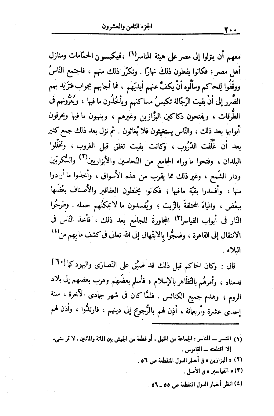 قال: وكان الحاكم قبل ذلك قد ضيّق على النّصارى واليهود كما [60] قدمناه، وأمرهم بالتّظاهر بالإسلام؛ فأسلم بعضهم وهرب بعضهم إلى بلاد الروم؛ وهدم جميع الكنائس. فلمّا كان فى شهر جمادى الآخرة، سنة إحدى عشرة وأربعمائة، أذن لهم بالرّجوع إلى دينهم، فارتدّوا، وأذن لهم