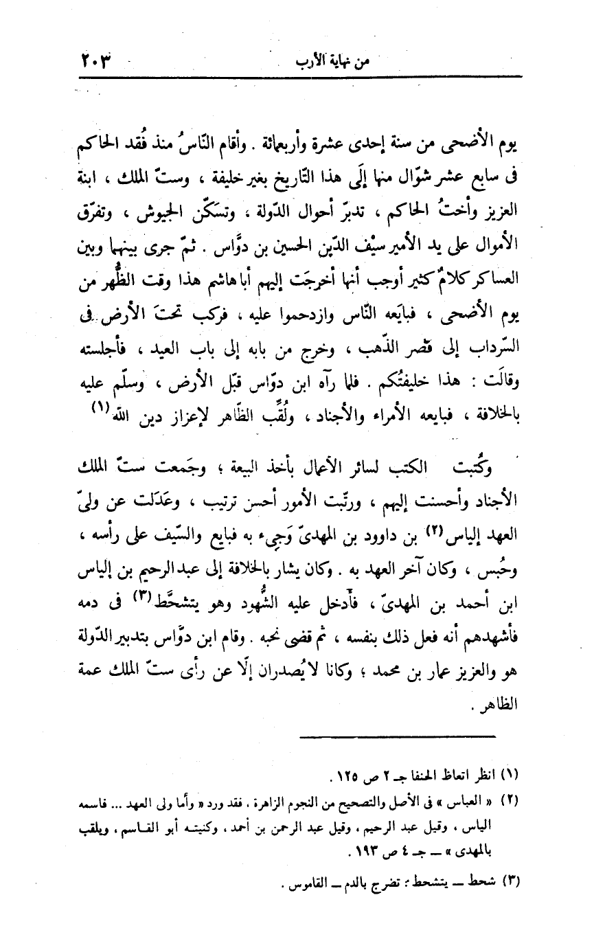 يوم الأضحى من سنة إحدى عشرة وأربعمائة. وأقام النّاس منذ فقد الحاكم فى سابع عشر شوّال منها إلى هذا التّاريخ بغير خليفة، وستّ الملك، ابنة العزيز وأخت الحاكم، تدبّر أحوال الدّولة، وتسكّن الجيوش، وتفرّق الأموال على يد الأمير سيف الدّين الحسين بن دوّاس. ثمّ جرى بينهما وبين العساكر كلام كثير أوجب أنها أخرجت إليهم أبا هاشم هذا وقت الظّهر من يوم الأضحى، فبايعه النّاس وازدحموا عليه، فركب تحت الأرض فى السّرداب إلى قصر الذّهب، وخرج من بابه إلى باب العيد، فأجلسته وقالت: هذا خليفتكم. فلما رآه ابن دوّاس قبّل الأرض، وسلّم عليه بالخلافة، فبايعه الأمراء والأجناد، ولقّب الظّاهر لإعزاز دين الله «1» وكتبت الكتب لسائر الأعمال بأخذ البيعة؛ وجمعت ستّ الملك الأجناد وأحسنت إليهم، ورتّبت الأمور أحسن ترتيب، وعدلت عن ولىّ العهد إلياس «2» بن داوود بن المهدىّ وجىء به فبايع والسّيف على رأسه، وحبس، وكان آخر العهد به. وكان يشار بالخلافة إلى عبد الرحيم بن إلياس ابن أحمد بن المهدىّ، فأدخل عليه الشّهود وهو يتشحّط «3» فى دمه فأشهدهم أنه فعل ذلك بنفسه، ثم قضى نحبه. وقام ابن دوّاس بتدبير الدّولة هو والعزيز عمار بن محمد؛ وكانا لا يصدران إلّا عن رأى ستّ الملك عمة الظاهر.