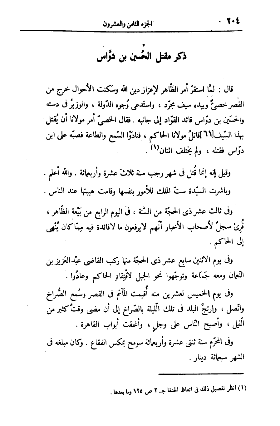 قال: لمّا استقرّ أمر الظّاهر لإعزاز دين الله وسكنت الأحوال خرج من القصر خصىّ وبيده سيف مجرّد، واستدعى وجوه الدّولة، والوزير فى دسته والحسين بن دوّاس قائد القوّاد إلى جانبه. فقال الخصىّ أمر مولانا أن يقتل بهذا السّيف [61] قاتل مولانا الحاكم، فنادوا السّمع والطاعة فصبّه على ابن دوّاس فقتله، ولم يختلف اثنان «1» .